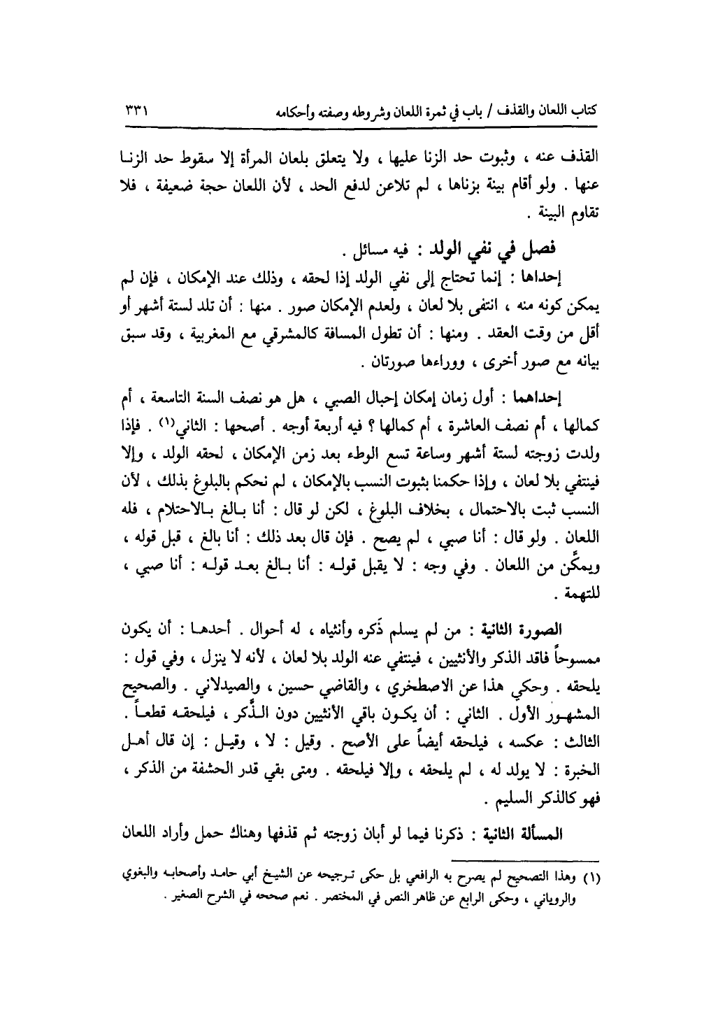 فصل في نفي الولد فيه مسائل. إحداها: إنما تحتاج إلى نفي الولد إذا لحقه، وذلك عند الامكان، فإن لم يمكن كونه منه، انتفى بلا لعان، ولعدم الامكان صور. منها: أن تلد لستة أشهر أو أقل من وقت العقد. ومنها: أن تطول المسافة كالمشرقي مع المغربية، وقد سبق بيانه مع صور أخرى، ووراءها صورتان. إحداها: أول زمان إمكان إحبال الصبي، هل هو نصف السنة التاسعة، أم كمالها، أم نصف العاشرة، أم كمالها ؟ فيه أربعة أوجه. أصحها: الثاني. فإذا ولدت زوجته لستة أشهر وساعة تسع الوطئ بعد زمن الامكان، لحقه الولد، وإلا فينتفي بلا لعان، وإذا حكمنا بثبوت النسب بالامكان، لم نحكم بالبلوغ بذلك، لان النسب ثبت بالاحتمال، بخلاف البلوغ، لكن لو قال: أنا بالغ بالاحتلام، فله اللعان. ولو قال: أنا صبي، لم يصح. فإن قال بعد ذلك: أنا بالغ، قبل قوله، ويمكن من اللعان. وفي وجه: لا يقبل قوله: أنا بالغ بعد قوله: أنا صبي، للتهمة. الصورة الثانية: من لم يسلم ذكره وأنثياه، له أحوال. أحدها: أن يكون ممسوحا فاقد الذكر والانثيين، فينتفي عنه الولد بلا لعان، لانه لا ينزل، وفي قول: يلحقه. وحكي هذا عن الاصطخري، والقاضي حسين، والصيدلاني. والصحيح المشهور الاول. الثاني: أن يكون باقي الانثيين دون الذكر، فيلحقه قطعا. الثالث: عكسه، فيلحقه أيضا على الاصح. وقيل: لا، وقيل: إن قال أهل الخبرة: لا يولد له، لم يلحقه، وإلا فيلحقه. ومتى بقي قدر الحشفة من الذكر، فهو كالذكر السليم. المسألة الثانية: ذكرنا فيما لو أبان زوجته ثم قذفها وهناك حمل وأراد اللعان