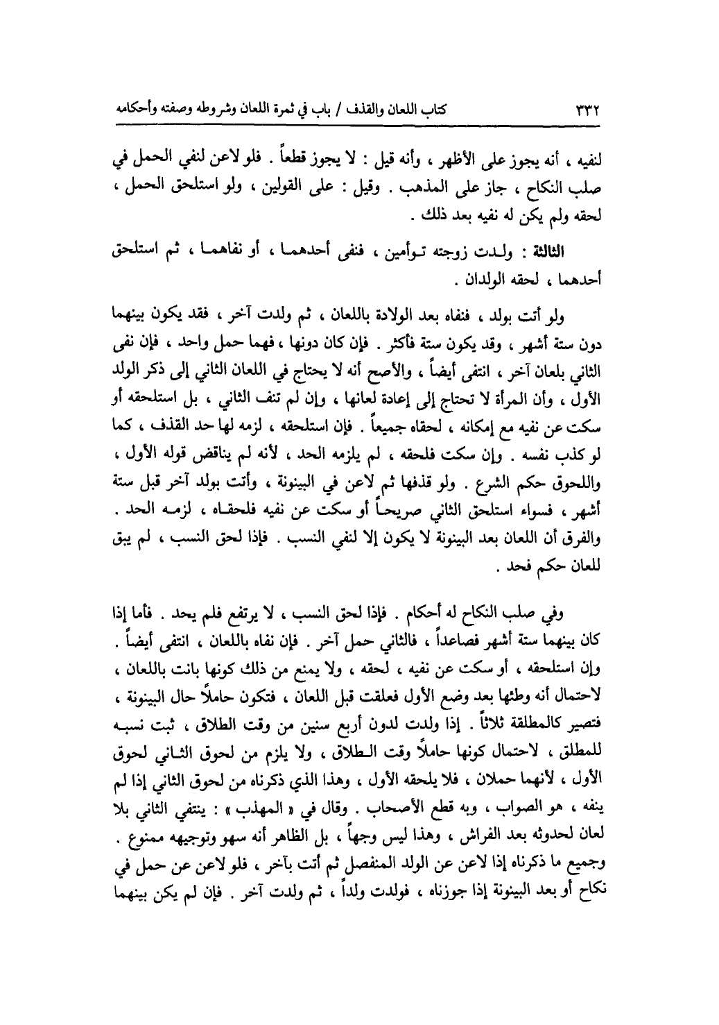 لنفيه، أنه يجوز على الاظهر، وأنه قيل: لا يجوز قطعا. فلو لاعن لنفي الحمل في صلب النكاح، جاز على المذهب. وقيل: على القولين، ولو استلحق الحمل، لحقه ولم يكن له نفيه بعد ذلك. الثالثة: ولدت زوجته توأمين، فنفى أحدهما، أو نفاهما، ثم استلحق أحدهما، لحقه الولدان. ولو أتت بولد، فنفاه بعد الولادة باللعان، ثم ولدت آخر، فقد يكون بينهما دون ستة أشهر، وقد يكون ستة فأكثر. فإن كان دونها، فهما حمل واحد، فإن نفى الثاني بلعان آخر، انتفى أيضا، والاصح أنه لا يحتاج في اللعان الثاني إلى ذكر الولد الاول، وأن المرأة لا تحتاج إلى إعادة لعانها، وإن لم تنف الثاني، بل استلحقه أو سكت عن نفيه مع إمكانه، لحقاه جميعا. فإن استلحقه، لزمه لها حد القذف، كما لو كذب نفسه. وإن سكت فلحقه، لم يلزمه الحد، لانه لم يناقض قوله الاول، واللحوق حكم الشرع. ولو قذفها ثم لاعن في البينونة، وأتت بولد آخر قبل ستة أشهر، فسواء استلحق الثاني صريحا أو سكت عن نفيه فلحقاه، لزمه الحد. والفرق أن اللعان بعد البينونة لا يكون إلا لنفي النسب. فإذا لحق النسب، لم يبق للعان حكم فحد. وفي صلب النكاح له أحكام. فإذا لحق النسب، لا يرتفع فلم يحد. فأما إذا كان بينهما ستة أشهر فصاعدا، فالثاني حمل آخر. فإن نفاه باللعان، انتفى أيضا. وإن استلحقه، أو سكت عن نفيه، لحقه، ولا يمنع من ذلك كونها بانت باللعان، لاحتمال أنه وطئها بعد وضع الاول فعلقت قبل اللعان، فتكون حاملا حال البينونة، فتصير كالمطلقة ثلاثا. إذا ولد ت لدون أربع سنين من وقت الطلاق، ثبت نسبه للمطلق، لاحتمال كونها حاملا وقت الطلاق، ولا يلزم من لحوق الثاني لحوق الاول، لانهما حملان، فلا يلحقه الاول، وهذا الذي ذكرناه من لحوق الثاني إذا لم ينفه، هو الصواب، وبه قطع الاصحاب. وقال في المهذب: ينتفي الثاني بلا لعان لحدوثه بعد الفراش، وهذا ليس وجها، بل الظاهر أنه سهو وتوجيهه ممنوع. وجميع ما ذكرناه إذا لاعن عن الولد المنفصل ثم أتت بآخر، فلو لاعن عن حمل في نكاح أو بعد البينونة إذا جوزناه، فولدت ولدا، ثم ولدت آخر، فإن لم يكن بينهما