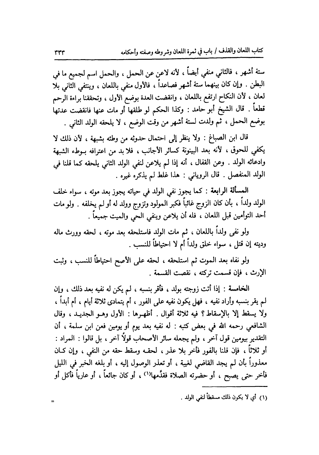 ستة أشهر، فالثاني منفي أيضا، لانه لاعن عن الحمل، والحمل إسم لجميع ما في البطن. وإن كان بينهما ستة أشهر فصاعدا، فالاول منفي باللعان، وينتفي الثاني بلا لعان، لان النكاح ارتفع باللعان، وانقضت العدة بوضع الاول، وتحققنا براءة الرحم قطعا. قال الشيخ أبو حامد: وكذا الحكم لو طلقها أو مات عنها فانقضت عدتها بوضع الحمل، ثم ولدت لستة أشهر من وقت الوضع، لا يلحقه الولد الثاني. قال ابن الصباغ: ولا ينظر إلى احتمال حدوثه من وطئه بشبهة، لان ذلك لا يكفي للحوق، لانه بعد البينونة كسائر الاجانب، فلا بد من اعترافه بوطئ الشبهة وادعائه الولد. وعن القفال، أنه إذا لم يلاعن لنفي الولد الثاني يلحقه كما قلنا في الولد المنفصل. قال الروياني: هذا غلط لم يذكره غيره. المسألة الرابعة: كما يجوز نفي الولد في حياته يجوز بعد موته، سواء خلف الولد ولدا، بأن كان الزوج غائبا فكبر المولود وتزوج وولد له أو لم يخلفه. ولو مات أحد التوأمين قبل اللعان، فله أن يلاعن وينفي الحي والميت جميعا. ولو نفى ولدا باللعان، ثم مات الولد فاستلحقه بعد موته، لحقه وورث ماله وديته إن قتل، سواء خلف ولدا أم لا احتياطا للنسب. ولو نفاه بعد الموت ثم استلحقه، لحقه على الاصح احتياطا للنسب، وثبت الارث، فإن قسمت تركته، نقصت القسمة. الخامسة: إذا أتت زوجته بولد، فأقر بنسبه، لم يكن له نفيه بعد ذلك، وإن لم يقر بنسبه وأراد نفيه، فهل يكون نفيه على الفور، أم يتمادى ثلاثة أيام، أم أبدا، ولا يسقط إلا بالاسقاط ؟ فيه ثلاثة أقوال. أظهرها: الاول وهو الجديد، وقال الشافعي رحمه الله في بعض كتبه: له نفيه بعد يوم أو يومين فعن ابن سلمة، أن التقدير بيومين قول آخر، ولم يجعله سائر الاصحاب قولا آخر، بل قالوا: المراد: أو ثلاثا، فإن قلنا بالفور فأخر بلا عذر، لحقه وسقط حقه من النفي، وإن كان معذورا بأن لم يجد القاضي لغيبة، أو تعذر الوصول إليه، أو بلغه الخبر في الليل فأخر حتى يصبح، أو حضرته الصلاة فقدمها، أو كان جائعا، أو عاريا فأكل أو