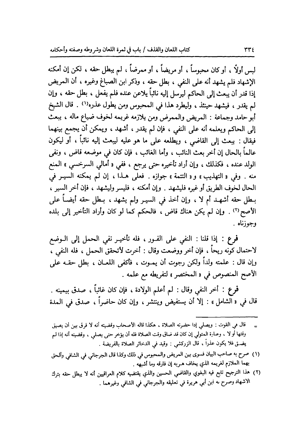 لبس أولا، أو كان محبوسا، أو مريضا، أو ممرضا، لم يبطل حقه، لكن إن أمكنه الاشهاد فلم يشهد أنه على النفي، بطل حقه، وذكر ابن الصباغ وغيره، أن المريض إذا قدر أن يبعث إلى الحاكم ليرسل إليه نائبا يلاعن عنده فلم يفعل، بطل حقه، وإن لم يقدر، فيشهد حينئذ، وليطرد هذا في المحبوس ومن يطول عذره. قال الشيخ أبو حامد وجماعة: المريض والممرض ومن يلازمه غريمه لخوف ضياع ماله، يبعث إلى الحاكم ويعلمه أنه على النفي، فإن لم يقدر، أشهد، ويمكن أن يجمع بينهما فيقال: يبعث إلى القاضي، ويطلعه على ما هو عليه ليبعث إليه نائبا، أو ليكون عالما بالحال إن أخر بعث النائب، وأما الغائب، فإن كان في موضعه قاض، ونفى الولد عنده، فكذلك، وإن أراد تأخيره حتى يرجع، ففي أمالي السرخسي المنع منه. وفي التهذيب والتتمة جوازه. فعلى هذا، إن لم يمكنه السير في الحال لخوف الطريق أو غيره فليشهد. وإن أمكنه، فليسر وليشهد، فإن أخر السير، بطل حقه أشهد أم لا، وإن أخذ في السير ولم يشهد، بطل حقه أيضا على الاصح. وإن لم يكن هناك قاض، فالحكم كما لو كان وأراد التأخير إلى بلده وجوزناه. فرع إذا قلنا: النفي على الفور، فله تأخير نفي الحمل إلى الوضع لاحتمال كونه ريحا، فإن أخر ووضعت وقال: أخرت لاتحقق الحمل، فله النفي، وإن قال: علمته ولدا ولكن رجوت أن يموت، فأكفى اللعان، بطل حقه على الاصح المنصوص في المختصر لتفريطه مع علمه. فرع أخر النفي وقال: لم أعلم الولادة، فإن كان غائبا، صدق بيمينه. قال في الشامل: إلا أن يستفيض وينتشر، وإن كان حاضرا، صدق في المدة