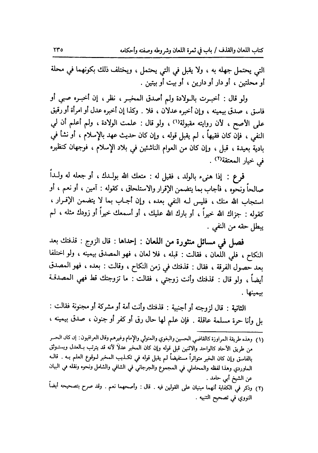 التي يحتمل جهله به، ولا يقبل في التي يحتمل، ويختلف ذلك بكونهما في محلة أو محلتين، أو دار أو دارين، أو بيت أو بيتين. ولو قال: أخبرت بالولادة ولم أصدق المخبر، نظر، إن أخبره صبي أو فاسق، صدق بيمينه، وإن أخبره عدلان، فلا. وكذا إن أخبره عدل أو إمرأة أو رقيق على الاصح، لان روايته مقبولة، ولو قال: علمت الولادة، ولم أعلم أن لي النفي، فإن كان فقيها، لم يقبل قوله، وإن كان حديث عهد بالاسلام، أو نشأ في بادية بعيدة، قبل، وإن كان من العوام الناشئين في بلاد الاسلام، فوجهان كنظيره في خيار المعتقة. فرع إذا هنئ بالولد، فقيل له: متعك الله بولدك، أو جعله له ولدا صالحا ونحوه، فأجاب بما يتضمن الاقرار والاستلحاق، كقوله: آمين، أو نعم، أو استجاب الله منك، فليس له النفي بعده، وإن أجاب بما لا يتضمن الاقرار، كقوله: جزاك الله خيرا، أو بارك الله عليك، أو أسمعك خيرا أو زودك مثله، لم يبطل حقه من النفي. فصل في مسائل منثورة من اللعان إحداها: قال الزوج: قذفتك بعد النكاح، فلي اللعان، فقالت: قبله، فلا لعان، فهو المصدق بيمينه، ولو اختلفا بعد حصول الفرقة، فقال: قذفتك في زمن النكاح، وقالت: بعده، فهو المصدق أيضا، ولو قال: قذفتك وأنت زوجتي، فقالت: ما تزوجتك قط فهي المصدقة بيمينها. الثانية: قال لزوجته أو أجنبية: قذفتك وأنت أمة أو مشركة أو مجنونة فقالت: بل وأنا حرة مسلمة عاقلة. فإن علم لها حال رق أو كفر أو جنون، صدق بيمينه،