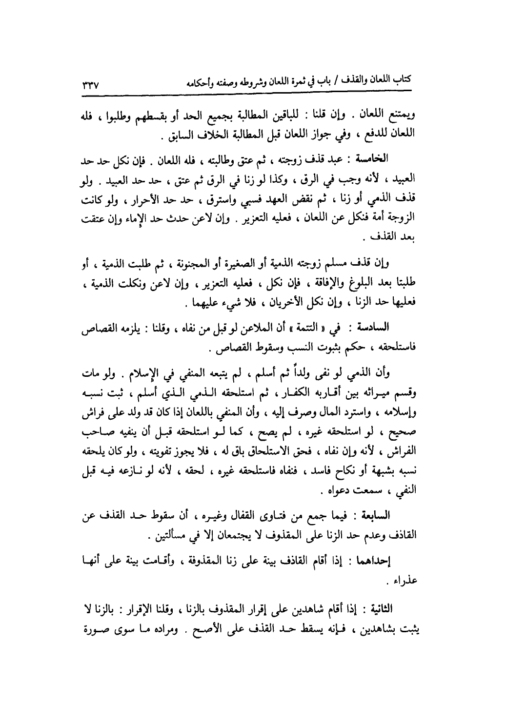 ويمتنع اللعان. وإن قلنا: للباقين المطالبة بجميع الحد أو بقسطهم وطلبوا، فله اللعان للدفع، وفي جواز اللعان قبل المطالبة الخلاف السابق. الخامسة: عبد قذف زوجته، ثم عتق وطالبته، فله اللعان. فإن نكل حد حد العبيد، لانه وجب في الرق، وكذا لو زنا في الرق ثم عتق، حد حد العبيد. ولو قذف الذمي أو زنا، ثم نقض العهد فسبي واسترق، حد حد الاحرار، ولو كانت الزوجة أمة فنكل عن اللعان، فعليه التعزير. وإن لاعن حدت حد الاماء وإن عتقت بعد القذف. وإن قذف مسلم زوجته الذمية أو الصغيرة أو المجنونة، ثم طلبت الذمية، أو طلبتا بعد البلوغ والافاقة، فإن نكل، فعليه التعزير، وإن لاعن ونكلت الذمية، فعليها حد الزنا، وإن نكل الاخريان، فلا شئ عليهما. السادسة: في التتمة أن الملاعن لو قبل من نفاه، وقلنا: يلزمه القصاص فاستلحقه، حكم بثبوت النسب وسقوط القصاص. وأن الذمي لو نفى ولدا ثم أسلم، لم يتبعه المنفي في الاسلام. ولو مات وقسم ميراثه بين أقاربه الكفار، ثم استلحقه الذمي الذي أسلم، ثبت نسبه وإسلامه، واسترد المال وصرف إليه، وأن المنفي باللعان إذا كان قد ولد على فراش صحيح، لو استلحقه غيره، لم يصح، كما لو استلحقه قبل أن ينفيه صاحب الفراش، لانه وإن نفاه، فحق الاستلحاق باق له، فلا يجوز تفويته، ولو كان يلحقه نسبه بشبهة أو نكاح فاسد، فنفاه فاستلحقه غيره، لحقه، لانه لو نازعه فيه قبل النفي، سمعت دعواه. السابعة: فيما جمع من فتاوى القفال وغيره، أن سقوط حد القذف عن القاذف وعدم حد الزنا على المقذوف لا يجتمعان إلا في مسألتين. إحداهما: إذا أقام القاذف بينة على زنا المقذوفة، وأقامت بينة على أنها عذراء. الثانية: إذا أقام شاهدين على إقرار المقذوف بالزنا، وقلنا الاقرار: بالزنا لا يثبت بشاهدين، فإنه يسقط حد القذف على الاصح. ومراده ما سوى صورة