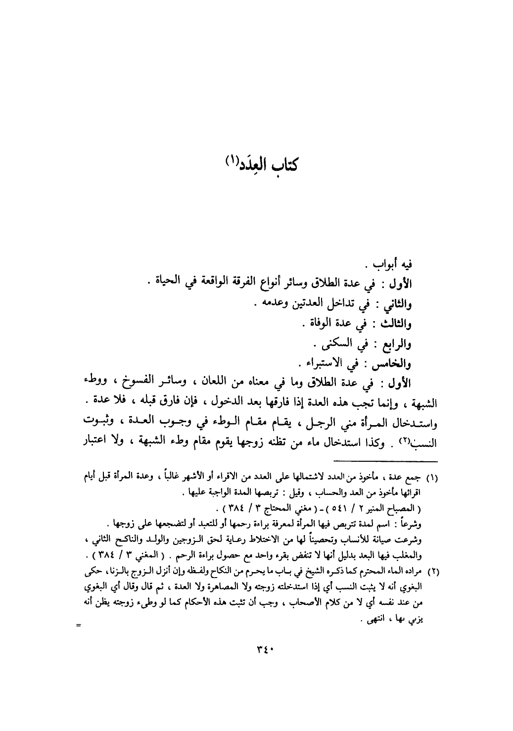 الأول : في عدة الطلاق وسائر أنواع الفرقة الواقعة في الحياة. والثاني: في تداخل العدتين وعدمه. والثالث: في عدة الوفاة. والرابع: في السكنى. والخامس: في الاستبراء.