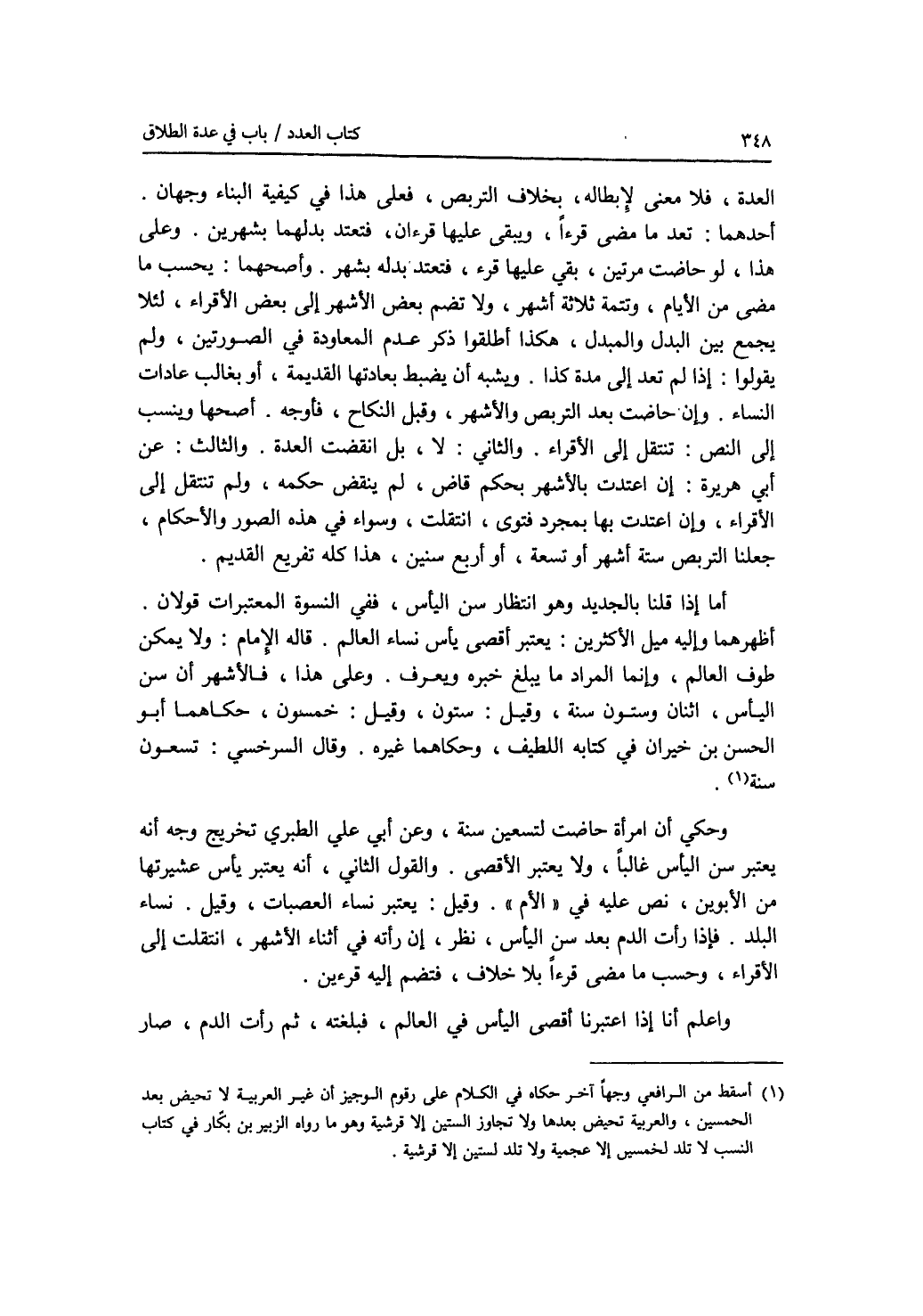 العدة، فلا معنى لابطاله، بخلاف التربص، فعلى هذا في كيفية البناء وجهان. أحدهما: تعد ما مضى قرءا، ويبقى عليها قرآن، فتعتد بدلهما بشهرين. وعلى هذا، لو حاضت مرتين، بقي عليها قرء، فتعتد بدله بشهر. وأصحهما: يحسب ما مضى من الايام، وتتمة ثلاثة أشهر، ولا تضم بعض الاشهر إلى بعض الاقراء، لئلا يجمع بين البدل والمبدل، هكذا أطلقوا ذكر عدم المعاودة في الصورتين، ولم يقولوا: إذا لم تعد إلى مدة كذا. ويشبه أن يضبط بعادتها القديمة، أو بغالب عادات النساء. وإن حاضت بعد التربص والاشهر، وقبل النكاح، فأوجه. أصحها وينسب إلى النص: تنتقل إلى الاقراء. والثاني: لا، بل انقضت العدة. والثالث: عن أبي هريرة: إن اعتدت بالاشهر بحكم قاض، لم ينقض حكمه، ولم تنتقل إلى الاقراء، وإن اعتدت بها بمجرد فتوى، انتقلت، وسواء في هذه الصور والاحكام، جعلنا التربص ستة أشهر أو تسعة، أو أربع سنين، هذا كله تفريع القديم. أما إذا قلنا بالجديد وهو انتظار سن اليأس، ففي النسوة المعتبرات قولان. أظهرهما وإليه ميل الاكثرين: يعتبر أقصى يأس نساء العالم. قال الامام: ولا يمكن طوف العالم، وإنما المراد ما يبلغ خبره ويعرف. وعلى هذا، فالاشهر أن سن اليأس، اثنان وستون سنة، وقيل: ستون، وقيل: خمسون، حكاهما أبو الحسن بن خيران في كتابه اللطيف، وحكاهما غيره. وقال السرخسي: تسعون سنة. وحكي أن إمرأة حاضت لتسعين سنة، وعن أبي علي الطبري تخريج وجه أنه يعتبر سن اليأس غالبا، ولا يعتبر الاقصى. والقول الثاني، أنه يعتبر يأس عشيرتها من الابوين، نص عليه في الام. وقيل: يعتبر نساء العصبات، وقيل: نساء البلد. فإذا رأت الدم بعد سن اليأس، نظر، إن رأته في أثناء الاشهر، انتقلت إلى الاقراء، وحسب ما مضى قرءا بلا خلاف، فتضم إليه قرءين. واعلم أنا إذا اعتبرنا أقصى اليأس في العالم، فبلغته، ثم رأت الدم، صار