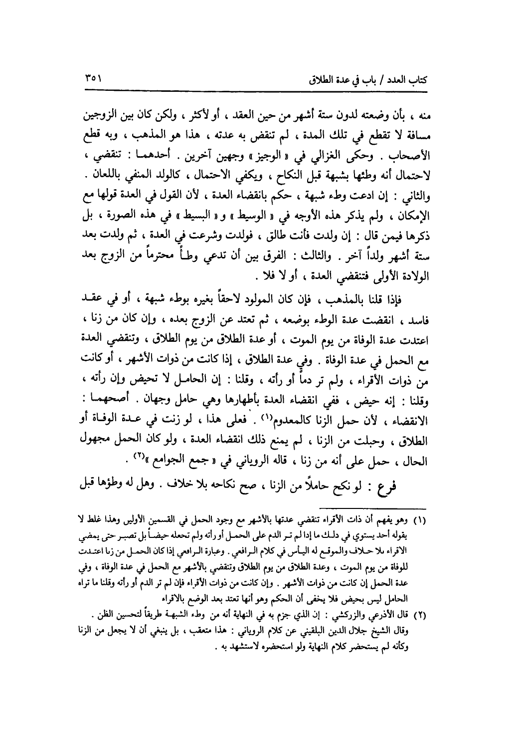 منه، بأن وضعته لدون ستة أشهر من حين العقد، أو لاكثر، ولكن كان بين الزوجين مسافة لا تقطع في تلك المدة، لم تنقض به عدته، هذا هو المذهب، وبه قطع الاصحاب. وحكى الغزالي في الوجيز وجهين آخرين. أحدهما: تنقضي، لاحتمال أنه وطئها بشبهة قبل النكاح، ويكفي الاحتمال، كالولد المنفي باللعان. والثاني: إن ادعت وطئ شبهة، حكم بانقضاء العدة، لان القول في العدة قولها مع الامكان، ولم يذكر هذه الاوجه في الوسيط والبسيط في هذه الصورة، بل ذكرها فيمن قال: إن ولدت فأنت طالق، فولدت وشرعت في العدة، ثم ولدت بعد ستة أشهر ولدا آخر. والثالث: الفرق بين أن تدعي وطءا محترما من الزوج بعد الولادة الاولى فتنقضي العدة، أو لا فلا. فإذا قلنا بالمذهب، فإن كان المولود لاحقا بغيره بوطئ شبهة، أو في عقد فاسد، انقضت عدة الوطئ بوضعه، ثم تعتد عن الزوج بعده، وإن كان من زنا، اعتدت عدة الوفاة من يوم الموت، أو عدة الطلاق من يوم الطلاق، وتنقضي العدة مع الحمل في عدة الوفاة. وفي عدة الطلاق، إذا كانت من ذوات الاشهر، أو كانت من ذوات الاقراء، ولم تر دما أو رأته، وقلنا: إن الحامل لا تحيض وإن رأته، وقلنا: إنه حيض، ففي انقضاء العدة بأطهارها وهي حامل وجهان. أصحهما: الانقضاء، لان حمل الزنا كالمعدوم. فعلى هذا، لو زنت في عدة الوفاة أو الطلاق، وحبلت من الزنا، لم يمنع ذلك انقضاء العدة، ولو كان الحمل مجهول الحال، حمل على أنه من زنا، قاله الروياني في جمع الجوامع. فرع لو نكح حاملا من الزنا، صح نكاحه بلا خلاف. وهل له وطؤها قبل