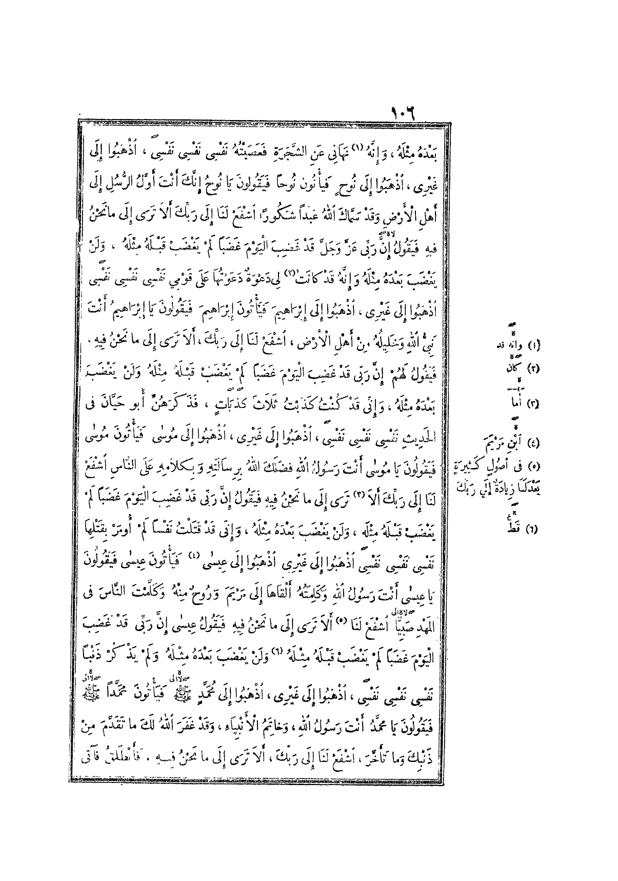 وَإِنِّي قَدْ كُنْتُ كَذَبْتُ ثَلاَثَ كَذِبَاتٍ، فَذَكَرَهُنَّ أَبُو حَيَّانَ فِي الحَدِيثِ، نَفْسِي نَفْسِي نَفْسِي، اذْهَبُوا إِلَى غَيْرِي، اذْهَبُوا إِلَى مُوسَى , فَيَأْتُونَ مُوسَى , فَيَقُولُونَ: يَا مُوسَى , أَنْتَ رَسُولُ اللهِ، فَضَّلَكَ اللَّهُ بِرِسَالَتِهِ وَبِكَلاَمِهِ عَلَى النَّاسِ، اشْفَعْ لَنَا إِلَى رَبِّكَ، أَلاَ تَرَى إِلَى مَا نَحْنُ فِيهِ؟ فَيَقُولُ: إِنَّ رَبِّي قَدْ غَضِبَ اليَوْمَ غَضَبًا , لَمْ يَغْضَبْ قَبْلَهُ مِثْلَهُ، وَلَنْ يَغْضَبَ بَعْدَهُ مِثْلَهُ، وَإِنِّي قَدْ قَتَلْتُ نَفْسًا لَمْ أُومَرْ بِقَتْلِهَا، نَفْسِي نَفْسِي نَفْسِي، اذْهَبُوا إِلَى غَيْرِي، اذْهَبُوا إِلَى عِيسَى، فَيَأْتُونَ عِيسَى، فَيَقُولُونَ: يَا عِيسَى , أَنْتَ رَسُولُ اللهِ، وَكَلِمَتُهُ أَلْقَاهَا إِلَى مَرْيَمَ وَرُوحٌ مِنْهُ، وَكَلَّمْتَ النَّاسَ فِي المَهْدِ صَبِيًّا، اشْفَعْ لَنَا , أَلاَ تَرَى إِلَى مَا نَحْنُ فِيهِ؟ فَيَقُولُ عِيسَى: إِنَّ رَبِّي قَدْ غَضِبَ اليَوْمَ غَضَبًا , لَمْ يَغْضَبْ قَبْلَهُ مِثْلَهُ، وَلَنْ يَغْضَبَ بَعْدَهُ مِثْلَهُ، وَلَمْ يَذْكُرْ ذَنْبًا، نَفْسِي نَفْسِي نَفْسِي , اذْهَبُوا إِلَى غَيْرِي , اذْهَبُوا إِلَى مُحَمَّدٍ صَلَّى اللَّهُ عَلَيْهِ وَسَلَّمَ، فَيَأْتُونَ مُحَمَّدًا صَلَّى اللَّهُ عَلَيْهِ وَسَلَّمَ , فَيَقُولُونَ: يَا مُحَمَّدُ , أَنْتَ رَسُولُ اللهِ , وَخَاتِمُ الأَنْبِيَاءِ، وَقَدْ غَفَرَ اللَّهُ لَكَ مَا تَقَدَّمَ مِنْ ذَنْبِكَ وَمَا تَأَخَّرَ، اشْفَعْ لَنَا إِلَى رَبِّكَ , أَلاَ تَرَى إِلَى مَا نَحْنُ فِيهِ، فَأَنْطَلِقُ , فَآتِي تَحْتَ العَرْشِ، فَأَقَعُ سَاجِدًا لِرَبِّي عَزَّ وَجَلَّ، ثُمَّ يَفْتَحُ اللَّهُ عَلَيَّ مِنْ مَحَامِدِهِ وَحُسْنِ الثَّنَاءِ عَلَيْهِ شَيْئًا، لَمْ يَفْتَحْهُ عَلَى أَحَدٍ قَبْلِي، ثُمَّ يُقَالُ: يَا مُحَمَّدُ , ارْفَعْ رَأْسَكَ , سَلْ تُعْطَهْ، وَاشْفَعْ تُشَفَّعْ , فَأَرْفَعُ رَأْسِي، فَأَقُولُ: أُمَّتِي يَا رَبِّ، أُمَّتِي يَا رَبِّ، فَيُقَالُ: يَا مُحَمَّدُ , أَدْخِلْ مِنْ أُمَّتِكَ مَنْ لاَ حِسَابَ عَلَيْهِمْ مِنَ البَابِ الأَيْمَنِ مِنْ أَبْوَابِ الجَنَّةِ، وَهُمْ شُرَكَاءُ النَّاسِ فِيمَا سِوَى ذَلِكَ مِنَ الأَبْوَابِ، ثُمَّ قَالَ: وَالَّذِي نَفْسِي بِيَدِهِ، إِنَّ مَا بَيْنَ المِصْرَاعَيْنِ مِنْ مَصَارِيعِ الجَنَّةِ، كَمَا بَيْنَ مَكَّةَ وَحِمْيَرَ، أَوْ: كَمَا بَيْنَ مَكَّةَ وَبُصْرَى.