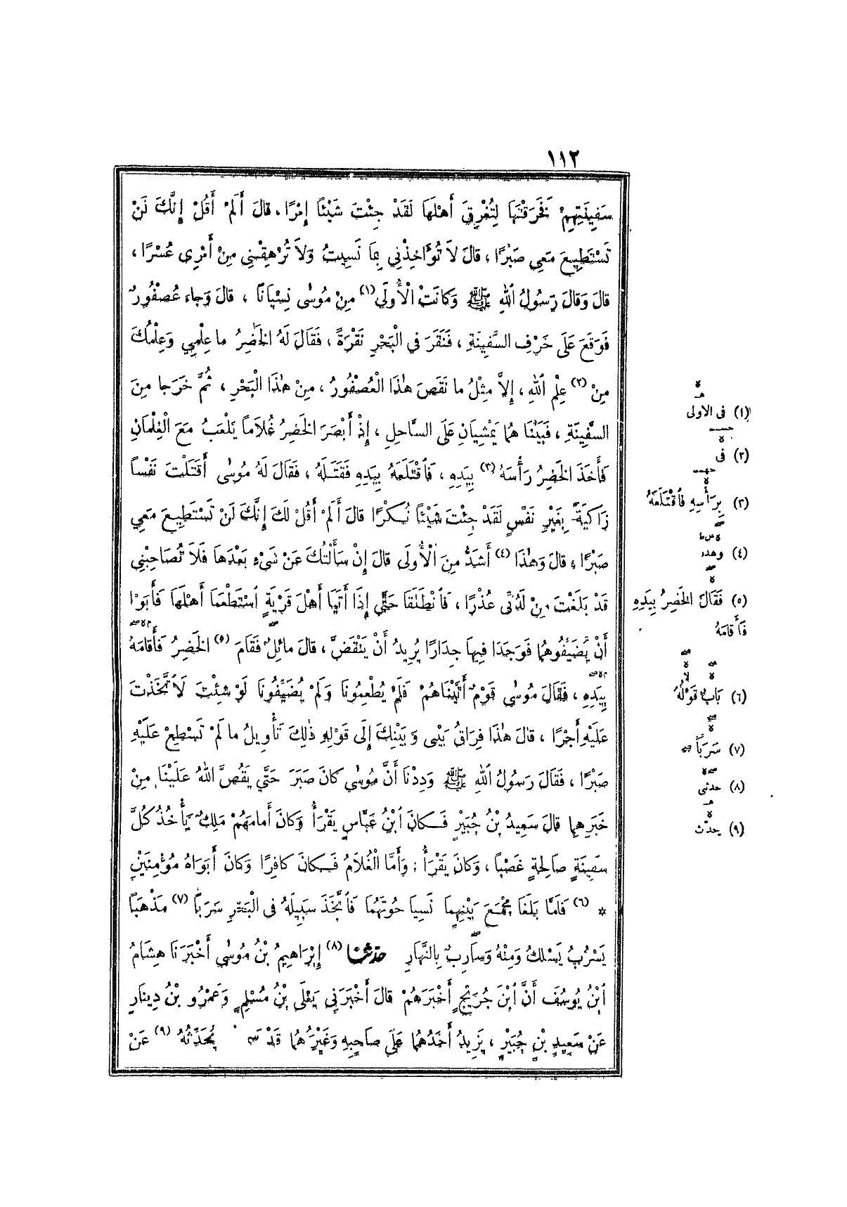 قَالَ : وَقَالَ رَسُولُ اللهِ صَلَّى اللَّهُ عَلَيْهِ وَسَلَّمَ : وَكَانَتِ الأُولَى مِنْ مُوسَى نِسْيَانًا ، قَالَ : وَجَاءَ عُصْفُورٌ فَوَقَعَ عَلَى حَرْفِ السَّفِينَةِ , فَنَقَرَ فِي البَحْرِ نَقْرَةً ، فَقَالَ لَهُ الخَضِرُ : مَا عِلْمِي وَعِلْمُكَ مِنْ عِلْمِ اللهِ إِلاَّ مِثْلُ مَا نَقَصَ هَذَا العُصْفُورُ مِنْ هَذَا البَحْرِ ، ثُمَّ خَرَجَا مِنَ السَّفِينَةِ , فَبَيْنَا هُمَا يَمْشِيَانِ عَلَى السَّاحِلِ , إِذْ أَبْصَرَ الخَضِرُ غُلاَمًا يَلْعَبُ مَعَ الغِلْمَانِ ، فَأَخَذَ الخَضِرُ رَأْسَهُ بِيَدِهِ , فَاقْتَلَعَهُ بِيَدِهِ فَقَتَلَهُ ، فَقَالَ لَهُ مُوسَى : {أَقَتَلْتَ نَفْسًا زَاكِيَةً بِغَيْرِ نَفْسٍ لَقَدْ جِئْتَ شَيْئًا نُكْرًا قَالَ أَلَمْ أَقُلْ لَكَ إِنَّكَ لَنْ تَسْتَطِيعَ مَعِي صَبْرًا} قَالَ : وَهَذِهِ أَشَدُّ مِنَ الأُولَى ، قَالَ : {إِنْ سَأَلْتُكَ عَنْ شَيْءٍ بَعْدَهَا فَلاَ تُصَاحِبْنِي قَدْ بَلَغْتَ مِنْ لَدُنِّي عُذْرًا فَانْطَلَقَا حَتَّى إِذَا أَتَيَا أَهْلَ قَرْيَةٍ اسْتَطْعَمَا أَهْلَهَا فَأَبَوْا أَنْ يُضَيِّفُوهُمَا فَوَجَدَا فِيهَا جِدَارًا يُرِيدُ أَنْ يَنْقَضَّ} قَالَ : مَائِلٌ ، فَقَامَ الخَضِرُ , فَأَقَامَهُ بِيَدِهِ ، فَقَالَ مُوسَى : قَوْمٌ أَتَيْنَاهُمْ فَلَمْ يُطْعِمُونَا وَلَمْ يُضَيِّفُونَا : {لَوْ شِئْتَ لاَتَّخَذْتَ عَلَيْهِ أَجْرًا} قَالَ : {هَذَا فِرَاقُ بَيْنِي وَبَيْنِكَ} إِلَى قَوْلِهِ : {ذَلِكَ تَأْوِيلُ مَا لَمْ تَسْطِعْ عَلَيْهِ صَبْرًا} قَالَ رَسُولُ اللهِ صَلَّى اللَّهُ عَلَيْهِ وَسَلَّمَ : وَدِدْنَا أَنَّ مُوسَى كَانَ صَبَرَ حَتَّى يَقُصَّ اللَّهُ عَلَيْنَا مِنْ خَبَرِهِمَا , قَالَ سَعِيدُ بْنُ جُبَيْرٍ : فَكَانَ ابْنُ عَبَّاسٍ يَقْرَأُ : وَكَانَ أَمَامَهُمْ مَلِكٌ يَأْخُذُ كُلَّ سَفِينَةٍ صَالِحَةٍ غَصْبًا , وَكَانَ يَقْرَأُ : وَأَمَّا الغُلاَمُ فَكَانَ كَافِرًا وَكَانَ أَبَوَاهُ مُؤْمِنَيْنِ.