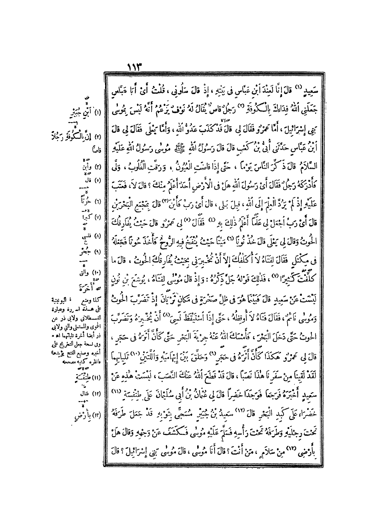 فَذَلِكَ قَوْلُهُ جَلَّ ذِكْرُهُ : {وَإِذْ قَالَ مُوسَى لِفَتَاهُ} يُوشَعَ بْنِ نُونٍ ، لَيْسَتْ عَنْ سَعِيدٍ ، قَالَ : فَبَيْنَمَا هُوَ فِي ظِلِّ صَخْرَةٍ فِي مَكَانٍ ثَرْيَانَ ، إِذْ تَضَرَّبَ الحُوتُ وَمُوسَى نَائِمٌ ، فَقَالَ فَتَاهُ : لاَ أُوقِظُهُ حَتَّى إِذَا اسْتَيْقَظَ نَسِيَ أَنْ يُخْبِرَهُ ، وَتَضَرَّبَ الحُوتُ , حَتَّى دَخَلَ البَحْرَ ، فَأَمْسَكَ اللَّهُ عَنْهُ جِرْيَةَ البَحْرِ ، حَتَّى كَأَنَّ أَثَرَهُ فِي حَجَرٍ ، قَالَ لِي عَمْرٌو : هَكَذَا كَأَنَّ أَثَرَهُ فِي حَجَرٍ ، وَحَلَّقَ بَيْنَ إِبْهَامَيْهِ وَاللَّتَيْنِ تَلِيَانِهِمَا : {لَقَدْ لَقِينَا مِنْ سَفَرِنَا هَذَا نَصَبًا} قَالَ : قَدْ قَطَعَ اللَّهُ عَنْكَ النَّصَبَ ، لَيْسَتْ هَذِهِ عَنْ سَعِيدٍ أَخْبَرَهُ ، فَرَجَعَا فَوَجَدَا خَضِرًا ، قَالَ لِي عُثْمَانُ بْنُ أَبِي سُلَيْمَانَ ، عَلَى طِنْفِسَةٍ خَضْرَاءَ ، عَلَى كَبِدِ البَحْرِ ، قَالَ سَعِيدُ بْنُ جُبَيْرٍ ، مُسَجًّى بِثَوْبِهِ , قَدْ جَعَلَ طَرَفَهُ تَحْتَ رِجْلَيْهِ ، وَطَرَفَهُ تَحْتَ رَأْسِهِ ، فَسَلَّمَ عَلَيْهِ مُوسَى , فَكَشَفَ عَنْ وَجْهِهِ ، وَقَالَ : هَلْ بِأَرْضِي مِنْ سَلاَمٍ , مَنْ أَنْتَ ؟ قَالَ : أَنَا مُوسَى ، قَالَ : مُوسَى بَنِي إِسْرَائِيلَ ؟ قَالَ : نَعَمْ ، قَالَ : فَمَا شَأْنُكَ ؟ قَالَ : جِئْتُ لِتُعَلِّمَنِي مِمَّا عُلِّمْتَ رَشَدًا ، قَالَ : أَمَا يَكْفِيكَ أَنَّ التَّوْرَاةَ بِيَدَيْكَ ، وَأَنَّ الوَحْيَ يَأْتِيكَ , يَا مُوسَى , إِنَّ لِي عِلْمًا لاَ يَنْبَغِي لَكَ أَنْ تَعْلَمَهُ ، وَإِنَّ لَكَ عِلْمًا لاَ يَنْبَغِي لِي أَنْ أَعْلَمَهُ ، فَأَخَذَ طَائِرٌ بِمِنْقَارِهِ مِنَ البَحْرِ ، فَقَالَ : وَاللهِ مَا عِلْمِي وَمَا عِلْمُكَ فِي جَنْبِ عِلْمِ اللهِ , إِلاَّ كَمَا أَخَذَ هَذَا الطَّائِرُ بِمِنْقَارِهِ مِنَ البَحْرِ ، حَتَّى إِذَا رَكِبَا فِي السَّفِينَةِ وَجَدَا مَعَابِرَ صِغَارًا ، تَحْمِلُ أَهْلَ هَذَا السَّاحِلِ إِلَى أَهْلِ هَذَا السَّاحِلِ الآخَرِ ، عَرَفُوهُ , فَقَالُوا : عَبْدُ اللهِ الصَّالِحُ ، قَالَ : قُلْنَا لِسَعِيدٍ : خَضِرٌ ؟ قَالَ : نَعَمْ ، لاَ نَحْمِلُهُ بِأَجْرٍ ، فَخَرَقَهَا , وَوَتَدَ فِيهَا وَتِدًا ،