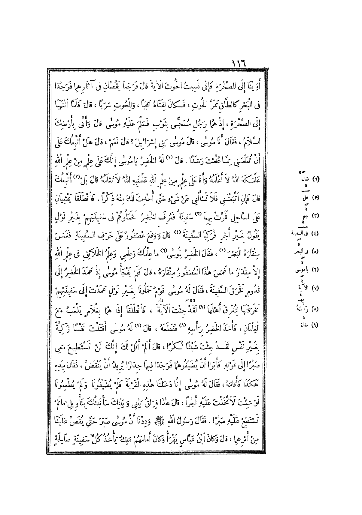 قَالَ : مُوسَى بَنِي إِسْرَائِيلَ ؟ قَالَ : نَعَمْ ، قَالَ : {هَلْ أَتَّبِعُكَ عَلَى أَنْ تُعَلِّمَنِي مِمَّا عُلِّمْتَ رَشَدًا} ؟ قَالَ لَهُ الخَضِرُ : يَا مُوسَى ، إِنَّكَ عَلَى عِلْمٍ مِنْ عِلْمِ اللهِ , عَلَّمَكَهُ اللَّهُ لاَ أَعْلَمُهُ ، وَأَنَا عَلَى عِلْمٍ مِنْ عِلْمِ اللهِ , عَلَّمَنِيهِ اللَّهُ لاَ تَعْلَمُهُ ، قَالَ : بَلْ أَتَّبِعُكَ {قَالَ فَإِنِ اتَّبَعْتَنِي فَلاَ تَسْأَلْنِي عَنْ شَيْءٍ حَتَّى أُحْدِثَ لَكَ مِنْهُ ذِكْرًا} فَانْطَلَقَا يَمْشِيَانِ عَلَى السَّاحِلِ , فَمَرَّتْ بِهِمَا سَفِينَةٌ , فَعُرِفَ الخَضِرُ , فَحَمَلُوهُمْ فِي سَفِينَتِهِمْ بِغَيْرِ نَوْلٍ ، يَقُولُ : بِغَيْرِ أَجْرٍ ، فَرَكِبَا السَّفِينَةَ ، قَالَ : وَوَقَعَ عُصْفُورٌ عَلَى حَرْفِ السَّفِينَةِ , فَغَمَسَ مِنْقَارَهُ فِي البَحْرِ ، فَقَالَ الخَضِرُ لِمُوسَى : مَا عِلْمُكَ وَعِلْمِي وَعِلْمُ الخَلاَئِقِ فِي عِلْمِ اللهِ , إِلاَّ مِقْدَارُ مَا غَمَسَ هَذَا العُصْفُورُ مِنْقَارَهُ ، قَالَ : فَلَمْ يَفْجَأْ مُوسَى إِذْ عَمَدَ الخَضِرُ إِلَى قَدُومٍ فَخَرَقَ السَّفِينَةَ ، فَقَالَ لَهُ مُوسَى : قَوْمٌ حَمَلُونَا بِغَيْرِ نَوْلٍ ، عَمَدْتَ إِلَى سَفِينَتِهِمْ فَخَرَقْتَهَا {لِتُغْرِقَ أَهْلَهَا لَقَدْ جِئْتَ} الآيَةَ ، فَانْطَلَقَا إِذَا هُمَا بِغُلاَمٍ يَلْعَبُ مَعَ الغِلْمَانِ ، فَأَخَذَ الخَضِرُ بِرَأْسِهِ فَقَطَعَهُ ، قَالَ لَهُ مُوسَى : {أَقَتَلْتَ نَفْسًا زَكِيَّةً بِغَيْرِ نَفْسٍ لَقَدْ جِئْتَ شَيْئًا نُكْرًا قَالَ أَلَمْ أَقُلْ لَكَ إِنَّكَ لَنْ تَسْتَطِيعَ مَعِي صَبْرًا} إِلَى قَوْلِهِ : {فَأَبَوْا أَنْ يُضَيِّفُوهُمَا فَوَجَدَا فِيهَا جِدَارًا يُرِيدُ أَنْ يَنْقَضَّ} فَقَالَ بِيَدِهِ : هَكَذَا ، فَأَقَامَهُ ، فَقَالَ لَهُ مُوسَى : إِنَّا دَخَلْنَا هَذِهِ القَرْيَةَ , فَلَمْ يُضَيِّفُونَا وَلَمْ يُطْعِمُونَا : {لَوْ شِئْتَ لاَتَّخَذْتَ عَلَيْهِ أَجْرًا قَالَ هَذَا فِرَاقُ بَيْنِي وَبَيْنِكَ سَأُنَبِّئُكَ بِتَأْوِيلِ مَا لَمْ تَسْتَطِعْ عَلَيْهِ صَبْرًا} فَقَالَ رَسُولُ اللهِ صَلَّى اللَّهُ عَلَيْهِ وَسَلَّمَ : وَدِدْنَا أَنَّ مُوسَى صَبَرَ حَتَّى يُقَصَّ عَلَيْنَا مِنْ أَمْرِهِمَا , قَالَ : وَكَانَ ابْنُ عَبَّاسٍ يَقْرَأُ : وَكَانَ أَمَامَهُمْ مَلِكٌ يَأْخُذُ كُلَّ سَفِينَةٍ صَالِحَةٍ غَصْبًا ، وَأَمَّا الغُلاَمُ فَكَانَ كَافِرًا.