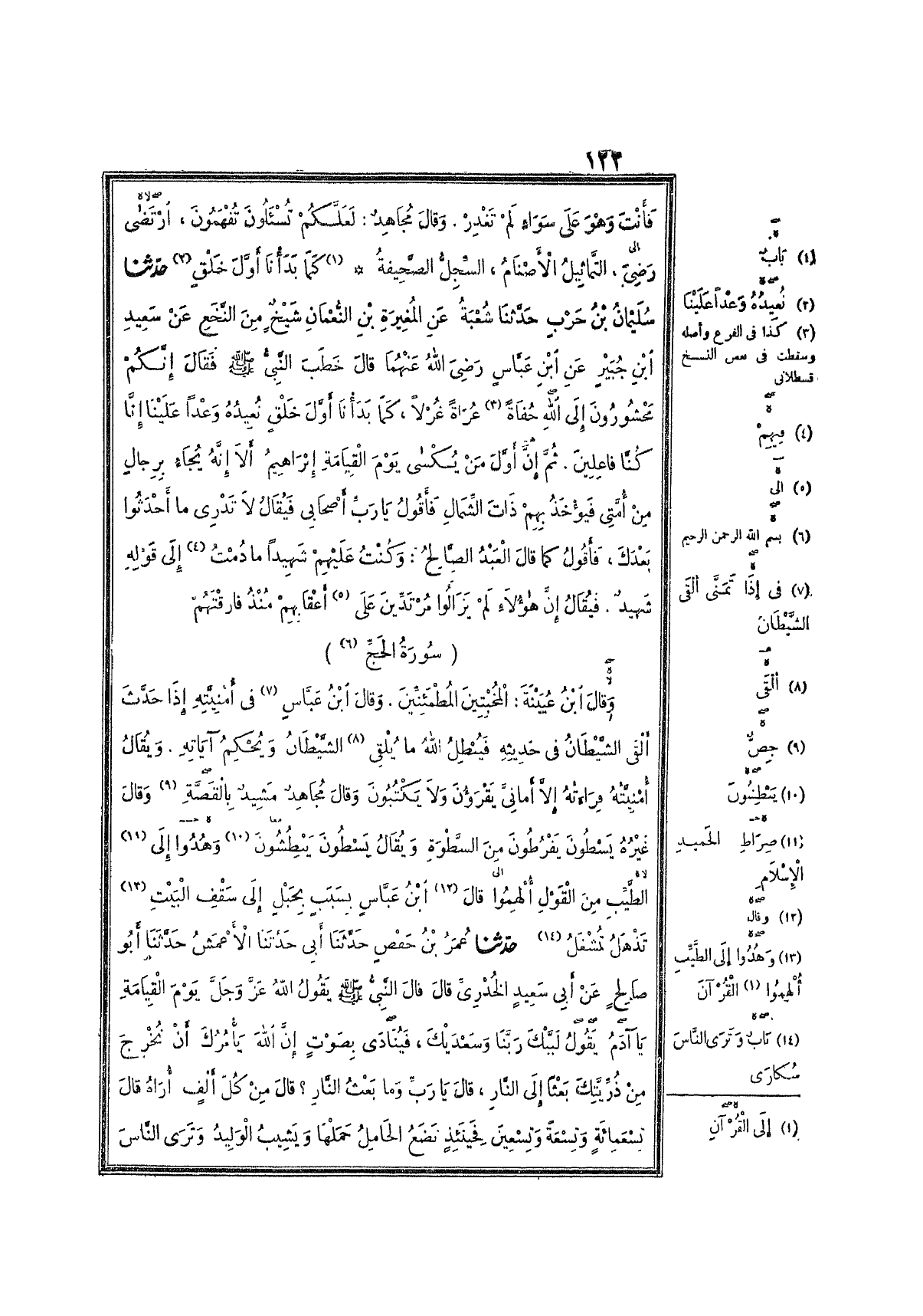 4740- حَدَّثَنَا سُلَيْمَانُ بْنُ حَرْبٍ ، حَدَّثَنَا شُعْبَةُ ، عَنِ المُغِيرَةِ بْنِ النُّعْمَانِ ، شَيْخٌٍ مِنَ النَّخَعِ ، عَنْ سَعِيدِ بْنِ جُبَيْرٍ ، عَنِ ابْنِ عَبَّاسٍ ، رَضِيَ اللَّهُ عَنْهُمَا ، قَالَ : خَطَبَ النَّبِيُّ صَلَّى اللَّهُ عَلَيْهِ وَسَلَّمَ فَقَالَ : إِنَّكُمْ مَحْشُورُونَ إِلَى اللهِ حُفَاةً عُرَاةً غُرْلاً : {كَمَا بَدَأْنَا أَوَّلَ خَلْقٍ نُعِيدُهُ وَعْدًا عَلَيْنَا إِنَّا كُنَّا فَاعِلِينَ} ثُمَّ إِنَّ أَوَّلَ مَنْ يُكْسَى يَوْمَ القِيَامَةِ إِبْرَاهِيمُ ، أَلاَ إِنَّهُ يُجَاءُ بِرِجَالٍ مِنْ أُمَّتِي ، فَيُؤْخَذُ بِهِمْ ذَاتَ الشِّمَالِ ، فَأَقُولُ : يَا رَبِّ أَصْحَابِي ، فَيُقَالُ : لاَ تَدْرِي مَا أَحْدَثُوا بَعْدَكَ ، فَأَقُولُ كَمَا قَالَ العَبْدُ الصَّالِحُ : {وَكُنْتُ عَلَيْهِمْ شَهِيدًا مَا دُمْتُ فِيهِمْ} إِلَى قَوْلِهِ : {شَهِيدٌ} فَيُقَالُ : إِنَّ هَؤُلاَءِ لَمْ يَزَالُوا مُرْتَدِّينَ عَلَى أَعْقَابِهِمْ مُنْذُ فَارَقْتَهُمْ.