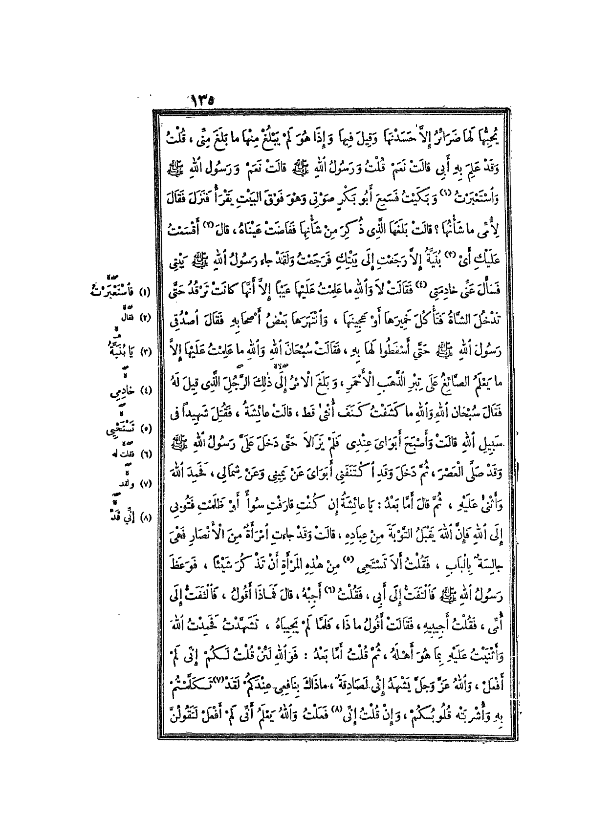 فَرَجَعْتُ إِلَى بَيْتِي كَأَنَّ الَّذِي خَرَجْتُ لَهُ لاَ أَجِدُ مِنْهُ قَلِيلاً ، وَلاَ كَثِيرًا , وَوُعِكْتُ , فَقُلْتُ لِرَسُولِ اللهِ صَلَّى اللَّهُ عَلَيْهِ وَسَلَّمَ : أَرْسِلْنِي إِلَى بَيْتِ أَبِي ، فَأَرْسَلَ مَعِي الغُلاَمَ , فَدَخَلْتُ الدَّارَ ، فَوَجَدْتُ أُمَّ رُومَانَ فِي السُّفْلِ ، وَأَبَا بَكْرٍ فَوْقَ البَيْتِ يَقْرَأُ ، فَقَالَتْ أُمِّي : مَا جَاءَ بِكِ يَا بُنَيَّةُ ؟ فَأَخْبَرْتُهَا وَذَكَرْتُ لَهَا الحَدِيثَ ، وَإِذَا هُوَ لَمْ يَبْلُغْ مِنْهَا مِثْلَ مَا بَلَغَ مِنِّي ، فَقَالَتْ : يَا بُنَيَّةُ ، خَفِّضِي عَلَيْكِ الشَّأْنَ , فَإِنَّهُ وَاللهِ لَقَلَّمَا كَانَتِ امْرَأَةٌ قَطُّ حَسْنَاءُ عِنْدَ رَجُلٍ يُحِبُّهَا , لَهَا ضَرَائِرُ , إِلاَّ حَسَدْنَهَا ، وَقِيلَ فِيهَا : وَإِذَا هُوَ لَمْ يَبْلُغْ مِنْهَا مَا بَلَغَ مِنِّي ، قُلْتُ : وَقَدْ عَلِمَ بِهِ أَبِي ؟ قَالَتْ : نَعَمْ ، قُلْتُ : وَرَسُولُ اللهِ صَلَّى اللَّهُ عَلَيْهِ وَسَلَّمَ ؟ قَالَتْ : نَعَمْ , وَرَسُولُ اللهِ صَلَّى اللَّهُ عَلَيْهِ وَسَلَّمَ , وَاسْتَعْبَرْتُ وَبَكَيْتُ ، فَسَمِعَ أَبُو بَكْرٍ صَوْتِي ، وَهُوَ فَوْقَ البَيْتِ يَقْرَأُ ، فَنَزَلَ , فَقَالَ لأُمِّي : مَا شَأْنُهَا ؟ قَالَتْ : بَلَغَهَا الَّذِي ذُكِرَ مِنْ شَأْنِهَا ، فَفَاضَتْ عَيْنَاهُ ، قَالَ : أَقْسَمْتُ عَلَيْكِ أَيْ بُنَيَّةُ , إِلاَّ رَجَعْتِ إِلَى بَيْتِكِ , فَرَجَعْتُ ، وَلَقَدْ جَاءَ رَسُولُ اللهِ صَلَّى اللَّهُ عَلَيْهِ وَسَلَّمَ بَيْتِي , فَسَأَلَ عَنِّي خَادِمَتِي ، فَقَالَتْ : لاَ وَاللهِ مَا عَلِمْتُ عَلَيْهَا عَيْبًا , إِلاَّ أَنَّهَا كَانَتْ تَرْقُدُ حَتَّى تَدْخُلَ الشَّاةُ ، فَتَأْكُلَ خَمِيرَهَا ، أَوْ : عَجِينَهَا ، وَانْتَهَرَهَا بَعْضُ أَصْحَابِهِ ، فَقَالَ : اصْدُقِي رَسُولَ اللهِ صَلَّى اللَّهُ عَلَيْهِ وَسَلَّمَ , حَتَّى أَسْقَطُوا لَهَا بِهِ ، فَقَالَتْ : سُبْحَانَ اللهِ , وَاللهِ مَا عَلِمْتُ عَلَيْهَا إِلاَّ مَا يَعْلَمُ الصَّائِغُ عَلَى تِبْرِ الذَّهَبِ الأَحْمَرِ ، وَبَلَغَ الأَمْرُ إِلَى ذَلِكَ الرَّجُلَِ الَّذِي قِيلَ لَهُ ، فَقَالَ : سُبْحَانَ اللهِ , وَاللهِ مَا كَشَفْتُ كَنَفَ أُنْثَى قَطُّ ، قَالَتْ عَائِشَةُ : فَقُتِلَ شَهِيدًا فِي سَبِيلِ اللهِ ، قَالَتْ : وَأَصْبَحَ أَبَوَايَ عِنْدِي ، فَلَمْ يَزَالاَ , حَتَّى دَخَلَ رَسُولُ اللهِ صَلَّى اللَّهُ عَلَيْهِ وَسَلَّمَ ، وَقَدْ صَلَّى العَصْرَ ، ثُمَّ دَخَلَ وَقَدِ اكْتَنَفَنِي أَبَوَايَ عَنْ يَمِينِي وَعَنْ شِمَالِي ، فَحَمِدَ اللَّهَ وَأَثْنَى عَلَيْهِ , ثُمَّ قَالَ : أَمَّا بَعْدُ ، يَا عَائِشَةُ , إِنْ كُنْتِ قَارَفْتِ سُوءًا , أَوْ ظَلَمْتِ , فَتُوبِي إِلَى اللهِ ، فَإِنَّ اللَّهَ يَقْبَلُ التَّوْبَةَ مِنْ عِبَادِهِ , قَالَتْ : وَقَدْ جَاءَتِ امْرَأَةٌ مِنَ الأَنْصَارِ , فَهِيَ جَالِسَةٌ بِالْبَابِ ،