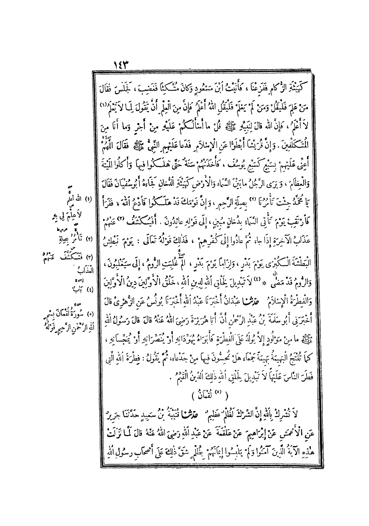 فَأَتَيْتُ ابْنَ مَسْعُودٍ ، وَكَانَ مُتَّكِئًا , فَغَضِبَ , فَجَلَسَ ، فَقَالَ : مَنْ عَلِمَ فَلْيَقُلْ ، وَمَنْ لَمْ يَعْلَمْ فَلْيَقُلِ : اللَّهُ أَعْلَمُ ، فَإِنَّ مِنَ العِلْمِ أَنْ يَقُولَ لِمَا لاَ يَعْلَمُ : لاَ أَعْلَمُ ، فَإِنَّ اللَّهَ قَالَ لِنَبِيِّهِ صَلَّى اللَّهُ عَلَيْهِ وَسَلَّمَ : {قُلْ مَا أَسْأَلُكُمْ عَلَيْهِ مِنْ أَجْرٍ وَمَا أَنَا مِنَ المُتَكَلِّفِينَ} وَإِنَّ قُرَيْشًا أَبْطَؤُوا عَنِ الإِسْلاَمِ ، فَدَعَا عَلَيْهِمُ النَّبِيُّ صَلَّى اللَّهُ عَلَيْهِ وَسَلَّمَ فَقَالَ : اللَّهُمَّ أَعِنِّي عَلَيْهِمْ بِسَبْعٍ كَسَبْعِ يُوسُفَ , فَأَخَذَتْهُمْ سَنَةٌ حَتَّى هَلَكُوا فِيهَا ، وَأَكَلُوا المَيْتَةَ وَالعِظَامَ ، وَيَرَى الرَّجُلُ مَا بَيْنَ السَّمَاءِ وَالأَرْضِ كَهَيْئَةِ الدُّخَانِ ، فَجَاءَهُ أَبُو سُفْيَانَ , فَقَالَ : يَا مُحَمَّدُ , جِئْتَ تَأْمُرُنَا بِصِلَةِ الرَّحِمِ ، وَإِنَّ قَوْمَكَ قَدْ هَلَكُوا , فَادْعُ اللَّهَ ، فَقَرَأَ : {فَارْتَقِبْ يَوْمَ تَأْتِي السَّمَاءُ بِدُخَانٍ مُبِينٍ} إِلَى قَوْلِهِ : {عَائِدُونَ} أَفَيُكْشَفُ عَنْهُمْ عَذَابُ الآخِرَةِ إِذَا جَاءَ , ثُمَّ عَادُوا إِلَى كُفْرِهِمْ ، فَذَلِكَ قَوْلُهُ تَعَالَى : {يَوْمَ نَبْطِشُ البَطْشَةَ الكُبْرَى} : يَوْمَ بَدْرٍ , وَلِزَامًا : يَوْمَ بَدْرٍ : {الم غُلِبَتِ الرُّومُ} إِلَى : {سَيَغْلِبُونَ} : وَالرُّومُ قَدْ مَضَى.