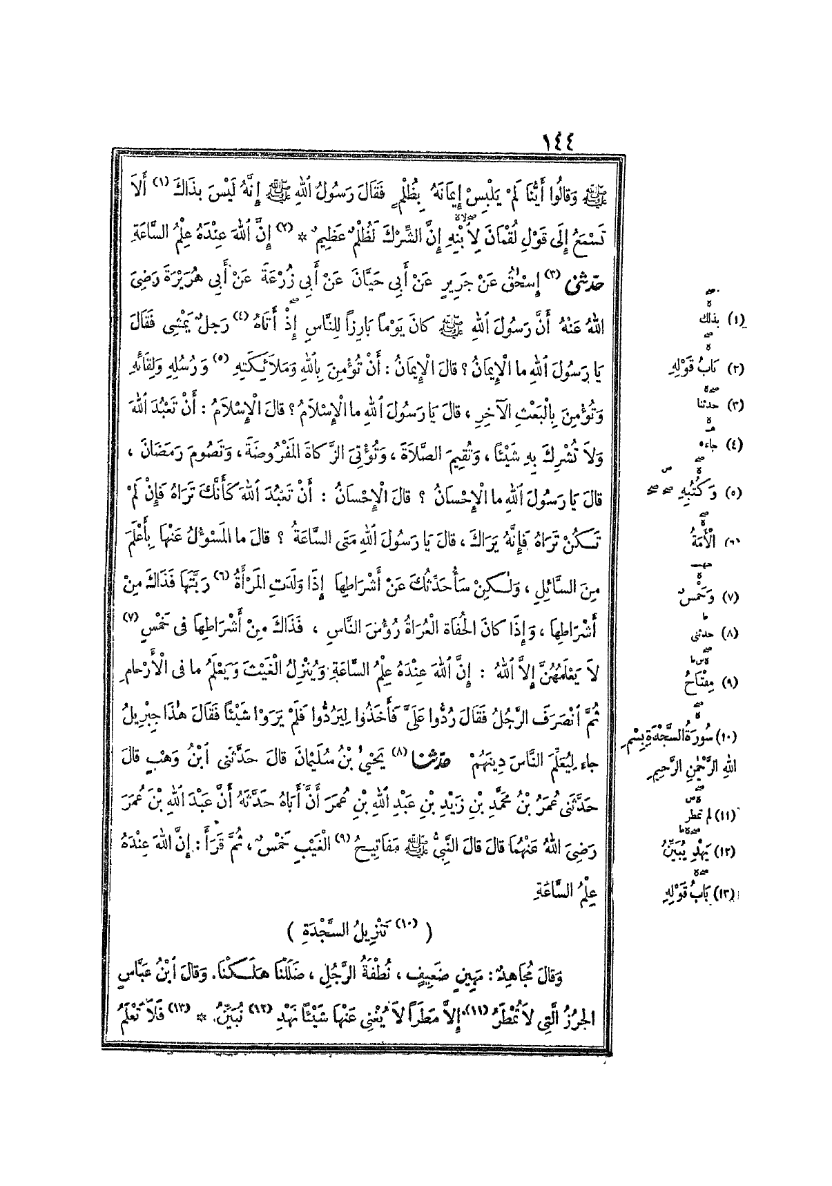 4777- حَدَّثَنِي إِسْحَاقُ ، عَنْ جَرِيرٍ ، عَنْ أَبِي حَيَّانَ ، عَنْ أَبِي زُرْعَةَ ، عَنْ أَبِي هُرَيْرَةَ ، رَضِيَ اللَّهُ عَنْهُ ؛ أَنَّ رَسُولَ اللهِ صَلَّى اللَّهُ عَلَيْهِ وَسَلَّمَ كَانَ يَوْمًا بَارِزًا لِلنَّاسِ ، إِذْ أَتَاهُ رَجُلٌ يَمْشِي ، فَقَالَ : يَا رَسُولَ اللهِ ، مَا الإِيمَانُ ؟ قَالَ : الإِيمَانُ أَنْ تُؤْمِنَ بِاللهِ , وَمَلاَئِكَتِهِ ، وَرُسُلِهِ ، وَلِقَائِهِ ، وَتُؤْمِنَ بِالْبَعْثِ الآخِرِ , قَالَ : يَا رَسُولَ اللهِ , مَا الإِسْلاَمُ ؟ قَالَ : الإِسْلاَمُ أَنْ تَعْبُدَ اللَّهَ ، وَلاَ تُشْرِكَ بِهِ شَيْئًا ، وَتُقِيمَ الصَّلاَةَ ، وَتُؤْتِيَ الزَّكَاةَ المَفْرُوضَةَ ، وَتَصُومَ رَمَضَانَ ، قَالَ : يَا رَسُولَ اللهِ ، مَا الإِحْسَانُ ؟ قَالَ : الإِحْسَانُ أَنْ تَعْبُدَ اللَّهَ كَأَنَّكَ تَرَاهُ ، فَإِنْ لَمْ تَكُنْ تَرَاهُ , فَإِنَّهُ يَرَاكَ ، قَالَ : يَا رَسُولَ اللهِ , مَتَى السَّاعَةُ ؟ قَالَ : مَا المَسْؤُولُ عَنْهَا بِأَعْلَمَ مِنَ السَّائِلِ ، وَلَكِنْ سَأُحَدِّثُكَ عَنْ أَشْرَاطِهَا : إِذَا وَلَدَتِ المَرْأَةُ رَبَّتَهَا ، فَذَاكَ مِنْ أَشْرَاطِهَا ، وَإِذَا كَانَ الحُفَاةُ العُرَاةُ رُؤُوسَ النَّاسِ ، فَذَاكَ مِنْ أَشْرَاطِهَا ، فِي خَمْسٍ لاَ يَعْلَمُهُنَّ إِلاَّ اللَّهُ : {إِنَّ اللَّهَ عِنْدَهُ عِلْمُ السَّاعَةِ وَيُنْزِلُ الغَيْثَ وَيَعْلَمُ مَا فِي الأَرْحَامِ} ثُمَّ انْصَرَفَ الرَّجُلُ ، فَقَالَ : رُدُّوا عَلَيَّ , فَأَخَذُوا لِيَرُدُّوا , فَلَمْ يَرَوْا شَيْئًا ، فَقَالَ : هَذَا جِبْرِيلُ , جَاءَ لِيُعَلِّمَ النَّاسَ دِينَهُمْ.