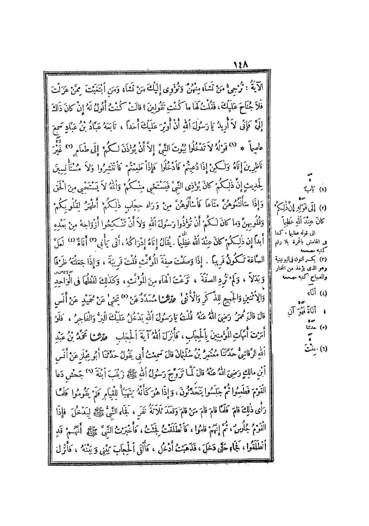 8- بَابُ قَوْلِهِ : {لاَ تَدْخُلُوا بُيُوتَ النَّبِيِّ إِلاَّ أَنْ يُؤْذَنَ لَكُمْ إِلَى طَعَامٍ غَيْرَ نَاظِرِينَ إِنَاهُ وَلَكِنْ إِذَا دُعِيتُمْ فَادْخُلُوا فَإِذَا طَعِمْتُمْ فَانْتَشِرُوا وَلاَ مُسْتَأْنِسِينَ لِحَدِيثٍ إِنَّ ذَلِكُمْ كَانَ يُؤْذِي النَّبِيَّ فَيَسْتَحْيِي مِنْكُمْ وَاللَّهُ لاَ يَسْتَحْيِي مِنَ الحَقِّ وَإِذَا سَأَلْتُمُوهُنَّ مَتَاعًا فَاسْأَلُوهُنَّ مِنْ وَرَاءِ حِجَابٍ ذَلِكُمْ أَطْهَرُ لِقُلُوبِكُمْ وَقُلُوبِهِنَّ وَمَا كَانَ لَكُمْ أَنْ تُؤْذُوا رَسُولَ اللهِ وَلاَ أَنْ تَنْكِحُوا أَزْوَاجَهُ مِنْ بَعْدِهِ أَبَدًا إِنَّ ذَلِكُمْ كَانَ عِنْدَ اللهِ عَظِيمًا}.
