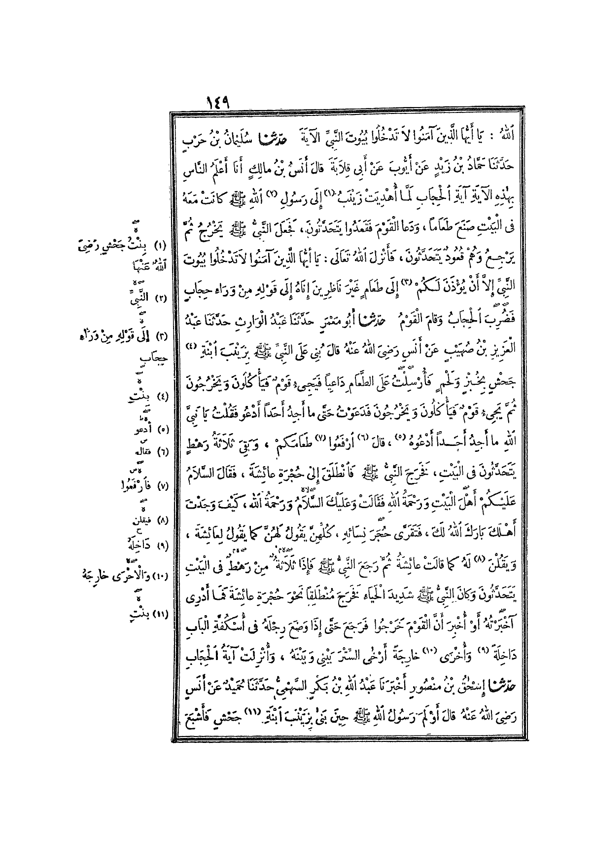 4792- حَدَّثَنَا سُلَيْمَانُ بْنُ حَرْبٍ ، حَدَّثَنَا حَمَّادُ بْنُ زَيْدٍ ، عَنْ أَيُّوبَ ، عَنْ أَبِي قِلاَبَةَ ، قَالَ أَنَسُ بْنُ مَالِكٍ : أَنَا أَعْلَمُ النَّاسِ بِهَذِهِ الآيَةِ : آيَةِ الحِجَابِ , لَمَّا أُهْدِيَتْ زَيْنَبُ إِلَى رَسُولِ اللهِ صَلَّى اللَّهُ عَلَيْهِ وَسَلَّمَ ، كَانَتْ مَعَهُ فِي البَيْتِ , صَنَعَ طَعَامًا وَدَعَا القَوْمَ ، فَقَعَدُوا يَتَحَدَّثُونَ ، فَجَعَلَ النَّبِيُّ صَلَّى اللَّهُ عَلَيْهِ وَسَلَّمَ يَخْرُجُ , ثُمَّ يَرْجِعُ ، وَهُمْ قُعُودٌ يَتَحَدَّثُونَ ، فَأَنْزَلَ اللَّهُ تَعَالَى : {يَا أَيُّهَا الَّذِينَ آمَنُوا لاَ تَدْخُلُوا بُيُوتَ النَّبِيِّ إِلاَّ أَنْ يُؤْذَنَ لَكُمْ إِلَى طَعَامٍ غَيْرَ نَاظِرِينَ إِنَاهُ} إِلَى قَوْلِهِ : {مِنْ وَرَاءِ حِجَابٍ} فَضُرِبَ الحِجَابُ , وَقَامَ القَوْمُ.