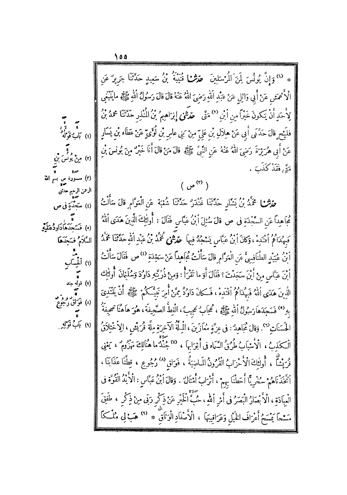 4807- حَدَّثَنِي مُحَمَّدُ بْنُ عَبْدِ اللهِ (1)، حَدَّثَنَا مُحَمَّدُ بْنُ عُبَيْدٍ الطَّنَافِسِيُّ ، عَنِ العَوَّامِ ، قَالَ : سَأَلْتُ مُجَاهِدًا عَنْ سَجْدَةِ {ص} فَقَالَ : سَأَلْتُ ابْنَ عَبَّاسٍ : مِنْ أَيْنَ سَجَدْتَ ؟ فَقَالَ : أَوَمَا تَقْرَأُ : {وَمِنْ ذُرِّيَّتِهِ دَاوُدَ وَسُلَيْمَانَ} {أُولَئِكَ الَّذِينَ هَدَى اللَّهُ فَبِهُدَاهُمُ اقْتَدِهْ} فَكَانَ دَاوُدُ مِمَّنْ أُمِرَ نَبِيُّكُمْ صَلَّى اللَّهُ عَلَيْهِ وَسَلَّمَ أَنْ يَقْتَدِيَ بِهِ , فَسَجَدَهَا دَاوُدُ عَلَيْهِ السَّلاَم , فَسَجَدَهَا رَسُولُ اللهِ صَلَّى اللَّهُ عَلَيْهِ وَسَلَّمَ.