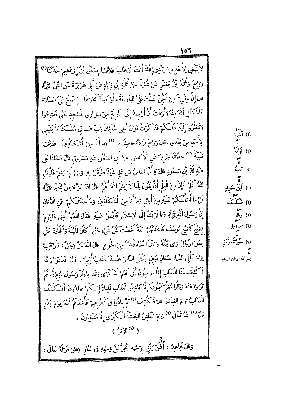 4809- حَدَّثَنَا قُتَيْبَةُ ، حَدَّثَنَا جَرِيرٌ ، عَنِ الأَعْمَشِ ، عَنْ أَبِي الضُّحَى ، عَنْ مَسْرُوقٍ ، قَالَ : دَخَلْنَا عَلَى عَبْدِ اللهِ بْنِ مَسْعُودٍ ، قَالَ : يَا أَيُّهَا النَّاسُ ، مَنْ عَلِمَ شَيْئًا فَلْيَقُلْ بِهِ ، وَمَنْ لَمْ يَعْلَمْ فَلْيَقُلِ : اللَّهُ أَعْلَمُ ، فَإِنَّ مِنَ العِلْمِ , أَنْ يَقُولَ لِمَا لاَ يَعْلَمُ اللَّهُ أَعْلَمُ ، قَالَ اللَّهُ عَزَّ وَجَلَّ لِنَبِيِّهِ صَلَّى اللَّهُ عَلَيْهِ وَسَلَّمَ : {قُلْ مَا أَسْأَلُكُمْ عَلَيْهِ مِنْ أَجْرٍ وَمَا أَنَا مِنَ المُتَكَلِّفِينَ} وَسَأُحَدِّثُكُمْ عَنِ الدُّخَانِ : إِنَّ رَسُولَ اللهِ صَلَّى اللَّهُ عَلَيْهِ وَسَلَّمَ دَعَا قُرَيْشًا إِلَى الإِسْلاَمِ ، فَأَبْطَؤُوا عَلَيْهِ ، فَقَالَ : اللَّهُمَّ أَعِنِّي عَلَيْهِمْ بِسَبْعٍ كَسَبْعِ يُوسُفَ , فَأَخَذَتْهُمْ سَنَةٌ , فَحَصَّتْ كُلَّ شَيْءٍ ، حَتَّى أَكَلُوا المَيْتَةَ وَالجُلُودَ ، حَتَّى جَعَلَ الرَّجُلُ يَرَى بَيْنَهُ وَبَيْنَ السَّمَاءِ دُخَانًا مِنَ الجُوعِ ، قَالَ اللَّهُ عَزَّ وَجَلَّ : {فَارْتَقِبْ يَوْمَ تَأْتِي السَّمَاءُ بِدُخَانٍ مُبِينٍ يَغْشَى النَّاسَ هَذَا عَذَابٌ أَلِيمٌ} قَالَ : فَدَعَوْا : {رَبَّنَا اكْشِفْ عَنَّا العَذَابَ إِنَّا مُؤْمِنُونَ أَنَّى لَهُمُ الذِّكْرَى وَقَدْ جَاءَهُمْ رَسُولٌ مُبِينٌ ثُمَّ تَوَلَّوْا عَنْهُ وَقَالُوا مُعَلَّمٌ مَجْنُونٌ إِنَّا كَاشِفُو العَذَابِ قَلِيلاً إِنَّكُمْ عَائِدُونَ} أَفَيُكْشَفُ العَذَابُ يَوْمَ القِيَامَةِ ؟ قَالَ : فَكُشِفَ , ثُمَّ عَادُوا فِي كُفْرِهِمْ ، فَأَخَذَهُمُ اللَّهُ يَوْمَ بَدْرٍ ، قَالَ اللَّهُ تَعَالَى : {يَوْمَ نَبْطِشُ البَطْشَةَ الكُبْرَى إِنَّا مُنْتَقِمُونَ}.