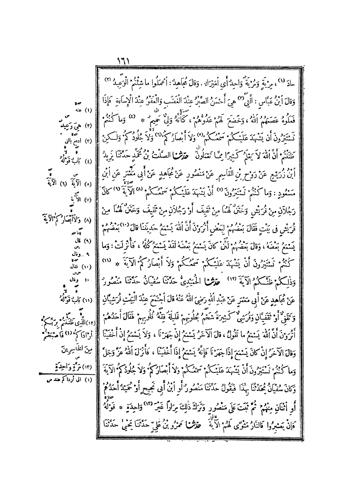 4816- حَدَّثَنَا الصَّلْتُ بْنُ مُحَمَّدٍ ، حَدَّثَنَا يَزِيدُ بْنُ زُرَيْعٍ ، عَنْ رَوْحِ بْنِ القَاسِمِ ، عَنْ مَنْصُورٍ ، عَنْ مُجَاهِدٍ ، عَنْ أَبِي مَعْمَرٍ ، عَنِ ابْنِ مَسْعُودٍ : {وَمَا كُنْتُمْ تَسْتَتِرُونَ أَنْ يَشْهَدَ عَلَيْكُمْ سَمْعُكُمْ} الآيَةَ , كَانَ رَجُلاَنِ مِنْ قُرَيْشٍ , وَخَتَنٌ لَهُمَا مِنْ ثَقِيفَ ، أَوْ : رَجُلاَنِ مِنْ ثَقِيفَ , وَخَتَنٌ لَهُمَا مِنْ قُرَيْشٍ فِي بَيْتٍ ، فَقَالَ بَعْضُهُمْ لِبَعْضٍ : أَتُرَوْنَ أَنَّ اللَّهَ يَسْمَعُ حَدِيثَنَا ؟ قَالَ بَعْضُهُمْ : يَسْمَعُ بَعْضَهُ ، وَقَالَ بَعْضُهُمْ : لَئِنْ كَانَ يَسْمَعُ بَعْضَهُ لَقَدْ يَسْمَعُ كُلَّهُ ، فَأُنْزِلَتْ : {وَمَا كُنْتُمْ تَسْتَتِرُونَ أَنْ يَشْهَدَ عَلَيْكُمْ سَمْعُكُمْ وَلاَ أَبْصَارُكُمْ} الآيَةَ.