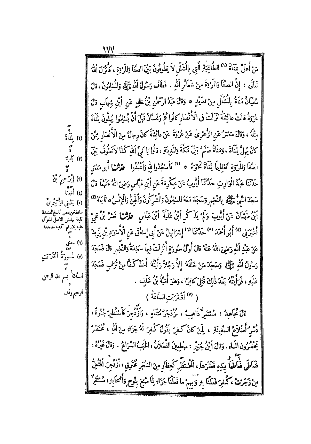 4862- حَدَّثَنَا أَبُو مَعْمَرٍ ، حَدَّثَنَا عَبْدُ الوَارِثِ ، حَدَّثَنَا أَيُّوبُ ، عَنْ عِكْرِمَةَ ، عَنِ ابْنِ عَبَّاسٍ ، رَضِيَ اللَّهُ عَنْهُمَا ، قَالَ : سَجَدَ النَّبِيُّ صَلَّى اللَّهُ عَلَيْهِ وَسَلَّمَ بِالنَّجْمِ , وَسَجَدَ مَعَهُ المُسْلِمُونَ وَالمُشْرِكُونَ وَالجِنُّ وَالإِنْسُ.