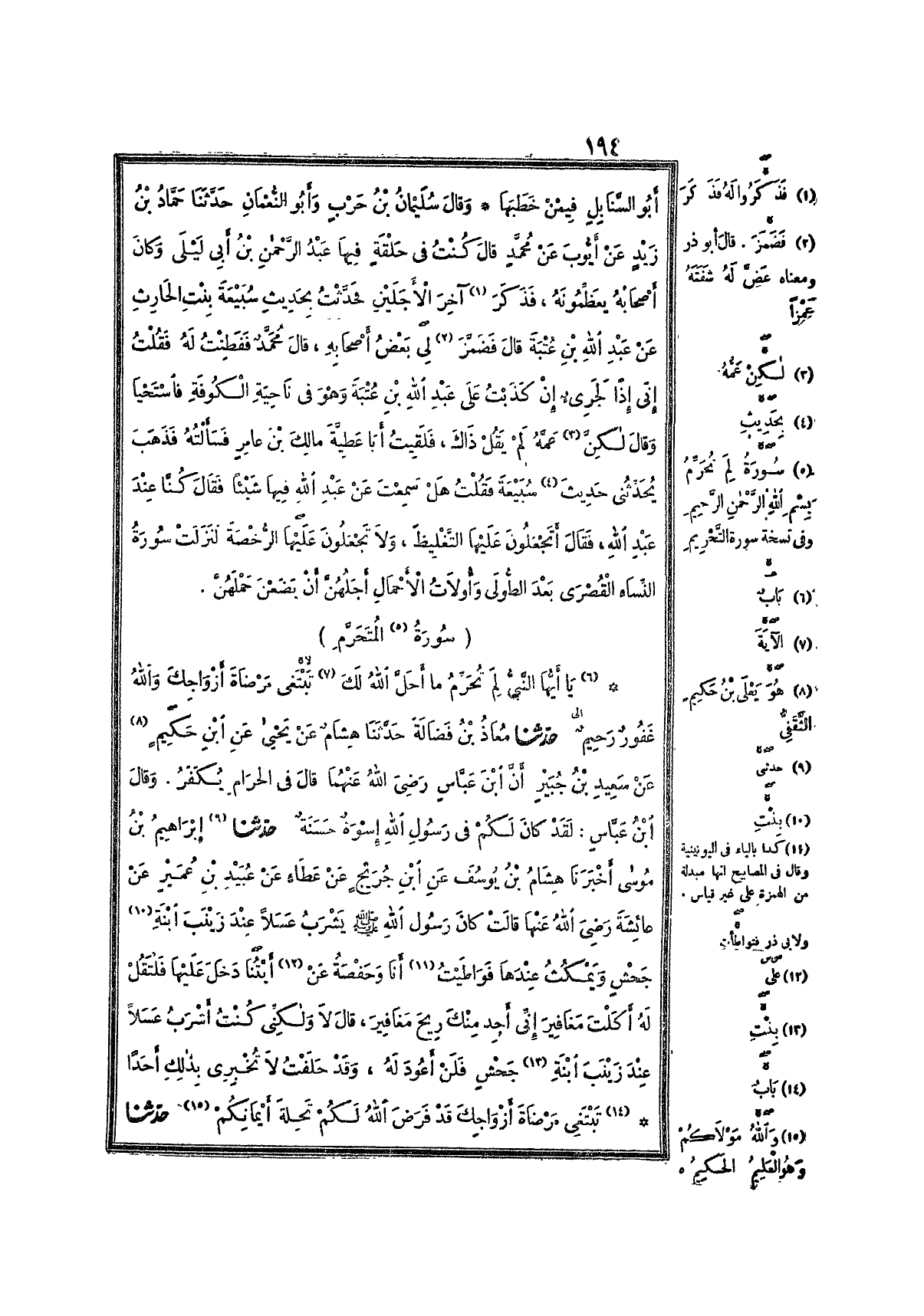 4910- وَقَالَ سُلَيْمَانُ بْنُ حَرْبٍ ، وَأَبُو النُّعْمَانِ : حَدَّثَنَا حَمَّادُ بْنُ زَيْدٍ ، عَنْ أَيُّوبَ ، عَنْ مُحَمَّدٍ ، قَالَ : كُنْتُ فِي حَلْقَةٍ فِيهَا عَبْدُ الرَّحْمَنِ بْنُ أَبِي لَيْلَى ، وَكَانَ أَصْحَابُهُ يُعَظِّمُونَهُ ، فَذَكَرَ آخِرَ الأَجَلَيْنِ ، فَحَدَّثْتُ بِحَدِيثِ سُبَيْعَةَ بِنْتِ الحَارِثِ ، عَنْ عَبْدِ اللهِ بْنِ عُتْبَةَ ، قَالَ : فَضَمَّزَ لِي بَعْضُ أَصْحَابِهِ ، قَالَ مُحَمَّدٌ : فَفَطِنْتُ لَهُ , فَقُلْتُ : إِنِّي إِذًا لَجَرِيءٌ إِنْ كَذَبْتُ عَلَى عَبْدِ اللهِ بْنِ عُتْبَةَ وَهُوَ فِي نَاحِيَةِ الكُوفَةِ ، فَاسْتَحْيَا , وَقَالَ : لَكِنَّ عَمُّهُ لَمْ يَقُلْ ذَاكَ ، فَلَقِيتُ أَبَا عَطِيَّةَ مَالِكَ بْنَ عَامِرٍ , فَسَأَلْتُهُ , فَذَهَبَ يُحَدِّثُنِي حَدِيثَ سُبَيْعَةَ ، فَقُلْتُ : هَلْ سَمِعْتَ عَنْ عَبْدِ اللهِ فِيهَا شَيْئًا ؟ فَقَالَ : كُنَّا عِنْدَ عَبْدِ اللهِ , فَقَالَ : أَتَجْعَلُونَ عَلَيْهَا التَّغْلِيظَ ، وَلاَ تَجْعَلُونَ عَلَيْهَا الرُّخْصَةَ ، لَنَزَلَتْ سُورَةُ النِّسَاءِ القُصْرَى بَعْدَ الطُّولَى : {وَأُولاَتُ الأَحْمَالِ أَجَلُهُنَّ أَنْ يَضَعْنَ حَمْلَهُنَّ}.