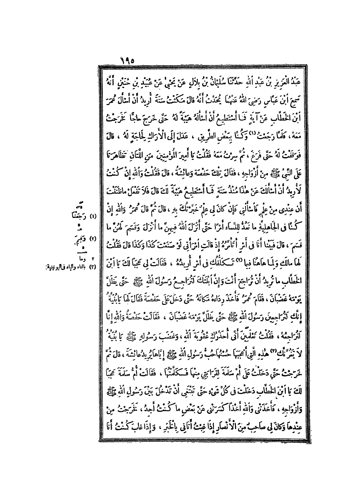 إِذْ قَالَتِ امْرَأَتِي : لَوْ صَنَعْتَ كَذَا وَكَذَا ، قَالَ : فَقُلْتُ لَهَا : مَا لَكَ ، وَلِمَا هَاهُنَا فِيمَا تَكَلُّفُكِ فِي أَمْرٍ أُرِيدُهُ ، فَقَالَتْ لِي : عَجَبًا لَكَ يَا ابْنَ الخَطَّابِ ، مَا تُرِيدُ أَنْ تُرَاجَعَ أَنْتَ , وَإِنَّ ابْنَتَكَ لَتُرَاجِعُ رَسُولَ اللهِ صَلَّى اللَّهُ عَلَيْهِ وَسَلَّمَ حَتَّى يَظَلَّ يَوْمَهُ غَضْبَانَ ، فَقَامَ عُمَرُ , فَأَخَذَ رِدَاءَهُ مَكَانَهُ , حَتَّى دَخَلَ عَلَى حَفْصَةَ ، فَقَالَ لَهَا : يَا بُنَيَّةُ , إِنَّكِ لَتُرَاجِعِينَ رَسُولَ اللهِ صَلَّى اللَّهُ عَلَيْهِ وَسَلَّمَ , حَتَّى يَظَلَّ يَوْمَهُ غَضْبَانَ ؟ فَقَالَتْ حَفْصَةُ : وَاللهِ إِنَّا لَنُرَاجِعُهُ ، فَقُلْتُ : تَعْلَمِينَ أَنِّي أُحَذِّرُكِ عُقُوبَةَ اللهِ ، وَغَضَبَ رَسُولِهِ صَلَّى اللَّهُ عَلَيْهِ وَسَلَّمَ ، يَا بُنَيَّةُ , لاَ يَغُرَّنَّكِ هَذِهِ الَّتِي أَعْجَبَهَا حُسْنُهَا حُبُّ رَسُولِ اللهِ صَلَّى اللَّهُ عَلَيْهِ وَسَلَّمَ إِيَّاهَا ، يُرِيدُ عَائِشَةَ ، قَالَ : ثُمَّ خَرَجْتُ حَتَّى دَخَلْتُ عَلَى أُمِّ سَلَمَةَ لِقَرَابَتِي مِنْهَا ، فَكَلَّمْتُهَا , فَقَالَتْ أُمُّ سَلَمَةَ : عَجَبًا لَكَ يَا ابْنَ الخَطَّابِ ، دَخَلْتَ فِي كُلِّ شَيْءٍ , حَتَّى تَبْتَغِيَ أَنْ تَدْخُلَ بَيْنَ رَسُولِ اللهِ صَلَّى اللَّهُ عَلَيْهِ وَسَلَّمَ وَأَزْوَاجِهِ ، فَأَخَذَتْنِي وَاللهِ أَخْذًا كَسَرَتْنِي عَنْ بَعْضِ مَا كُنْتُ أَجِدُ ، فَخَرَجْتُ مِنْ عِنْدِهَا ، وَكَانَ لِي صَاحِبٌ مِنَ الأَنْصَارِ إِذَا غِبْتُ أَتَانِي بِالخَبَرِ ، وَإِذَا غَابَ كُنْتُ أَنَا آتِيهِ بِالخَبَرِ ،