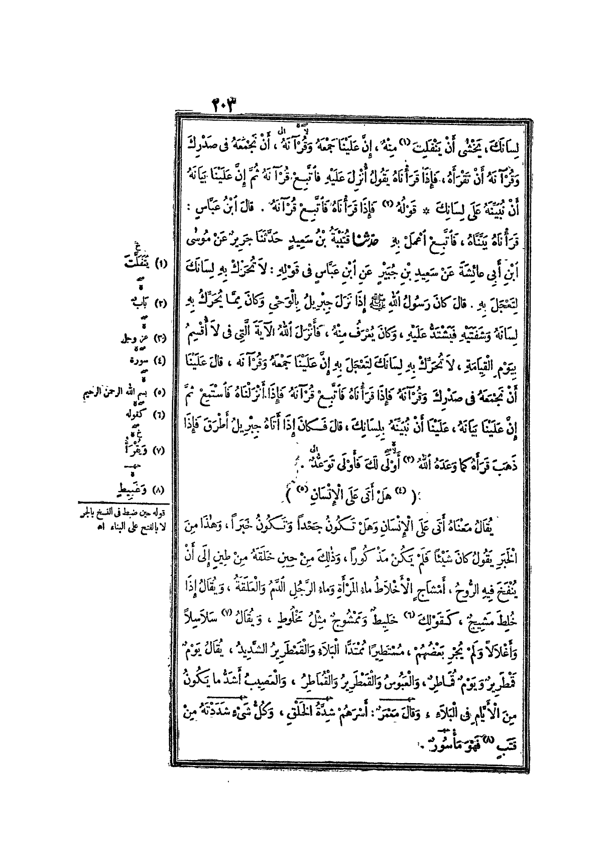 4929- حَدَّثَنَا قُتَيْبَةُ بْنُ سَعِيدٍ ، حَدَّثَنَا جَرِيرٌ ، عَنْ مُوسَى بْنِ أَبِي عَائِشَةَ ، عَنْ سَعِيدِ بْنِ جُبَيْرٍ ، عَنِ ابْنِ عَبَّاسٍ , فِي قَوْلِهِ : {لاَ تُحَرِّكْ بِهِ لِسَانَكَ لِتَعْجَلَ بِهِ} قَالَ : كَانَ رَسُولُ اللهِ صَلَّى اللَّهُ عَلَيْهِ وَسَلَّمَ إِذَا نَزَلَ جِبْرِيلُ عَلَيْهِ بِالوَحْيِ ، وَكَانَ مِمَّا يُحَرِّكُ بِهِ لِسَانَهُ وَشَفَتَيْهِ فَيَشْتَدُّ عَلَيْهِ ، وَكَانَ يُعْرَفُ مِنْهُ ، فَأَنْزَلَ اللَّهُ الآيَةَ الَّتِي فِي : {لا أُقْسِمُ بِيَوْمِ القِيَامَةِ} : {لاَ تُحَرِّكْ بِهِ لِسَانَكَ لِتَعْجَلَ بِهِ إِنَّ عَلَيْنَا جَمْعَهُ وَقُرْآنَهُ} قَالَ : عَلَيْنَا أَنْ نَجْمَعَهُ فِي صَدْرِكَ : {وَقُرْآنَهُ فَإِذَا قَرَأْنَاهُ فَاتَّبِعْ قُرْآنَهُ} : فَإِذَا أَنْزَلْنَاهُ فَاسْتَمِعْ : {ثُمَّ إِنَّ عَلَيْنَا بَيَانَهُ} : عَلَيْنَا أَنْ نُبَيِّنَهُ بِلِسَانِكَ ، قَالَ : فَكَانَ إِذَا أَتَاهُ جِبْرِيلُ أَطْرَقَ ، فَإِذَا ذَهَبَ قَرَأَهُ كَمَا وَعَدَهُ اللَّهُ : {أَوْلَى لَكَ فَأَوْلَى} تَوَعُّدٌ.