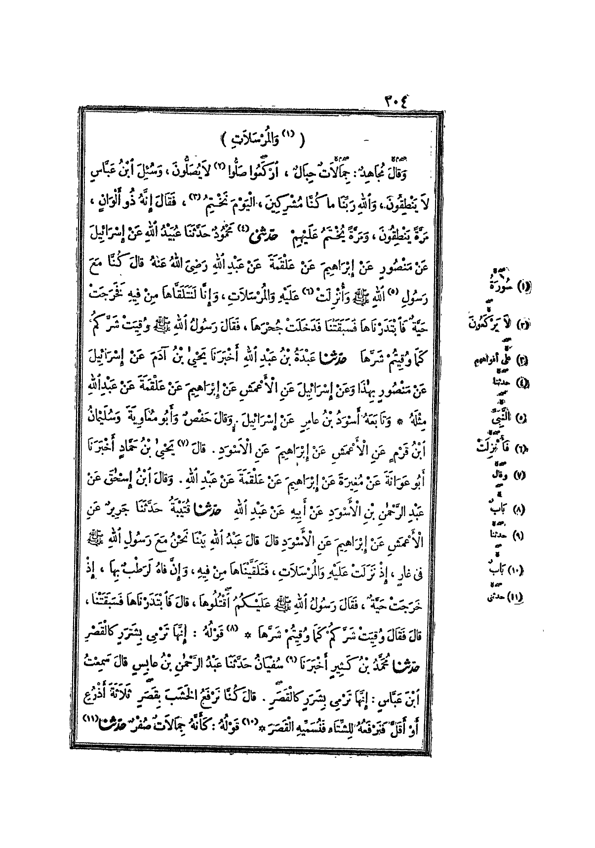 - حَدَّثَنَا قُتَيْبَةُ ، حَدَّثَنَا جَرِيرٌ ، عَنِ الأَعْمَشِ ، عَنْ إِبْرَاهِيمَ ، عَنِ الأَسْوَدِ ، قَالَ : قَالَ عَبْدُ اللهِ : بَيْنَا نَحْنُ مَعَ رَسُولِ اللهِ صَلَّى اللَّهُ عَلَيْهِ وَسَلَّمَ فِي غَارٍ ، إِذْ نَزَلَتْ عَلَيْهِ : {وَالمُرْسَلاَتِ} فَتَلَقَّيْنَاهَا مِنْ فِيهِ ، وَإِنَّ فَاهُ لَرَطْبٌ بِهَا ، إِذْ خَرَجَتْ حَيَّةٌ ، فَقَالَ رَسُولُ اللهِ صَلَّى اللَّهُ عَلَيْهِ وَسَلَّمَ : عَلَيْكُمُ اقْتُلُوهَا , قَالَ : فَابْتَدَرْنَاهَا , فَسَبَقَتْنَا ، قَالَ : فَقَالَ : وُقِيَتْ شَرَّكُمْ كَمَا وُقِيتُمْ شَرَّهَا.