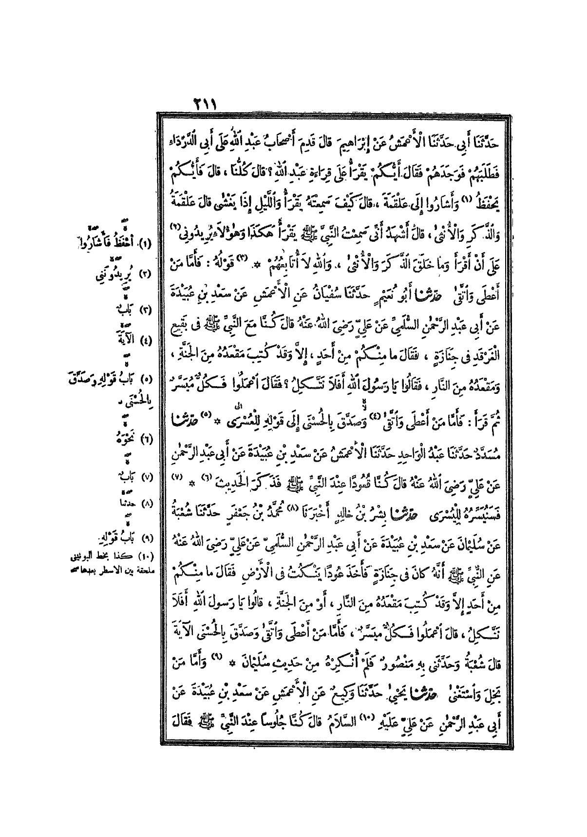 - حَدَّثَنَا مُسَدَّدٌ ، حَدَّثَنَا عَبْدُ الوَاحِدِ ، حَدَّثَنَا الأَعْمَشُ ، عَنْ سَعْدِ بْنِ عُبَيْدَةَ ، عَنْ أَبِي عَبْدِ الرَّحْمَنِ ، عَنْ عَلِيٍّ ، رَضِيَ اللَّهُ عَنْهُ ، قَالَ : كُنَّا قُعُودًا عِنْدَ النَّبِيِّ صَلَّى اللَّهُ عَلَيْهِ وَسَلَّمَ ، فَذَكَرَ الحَدِيثَ.