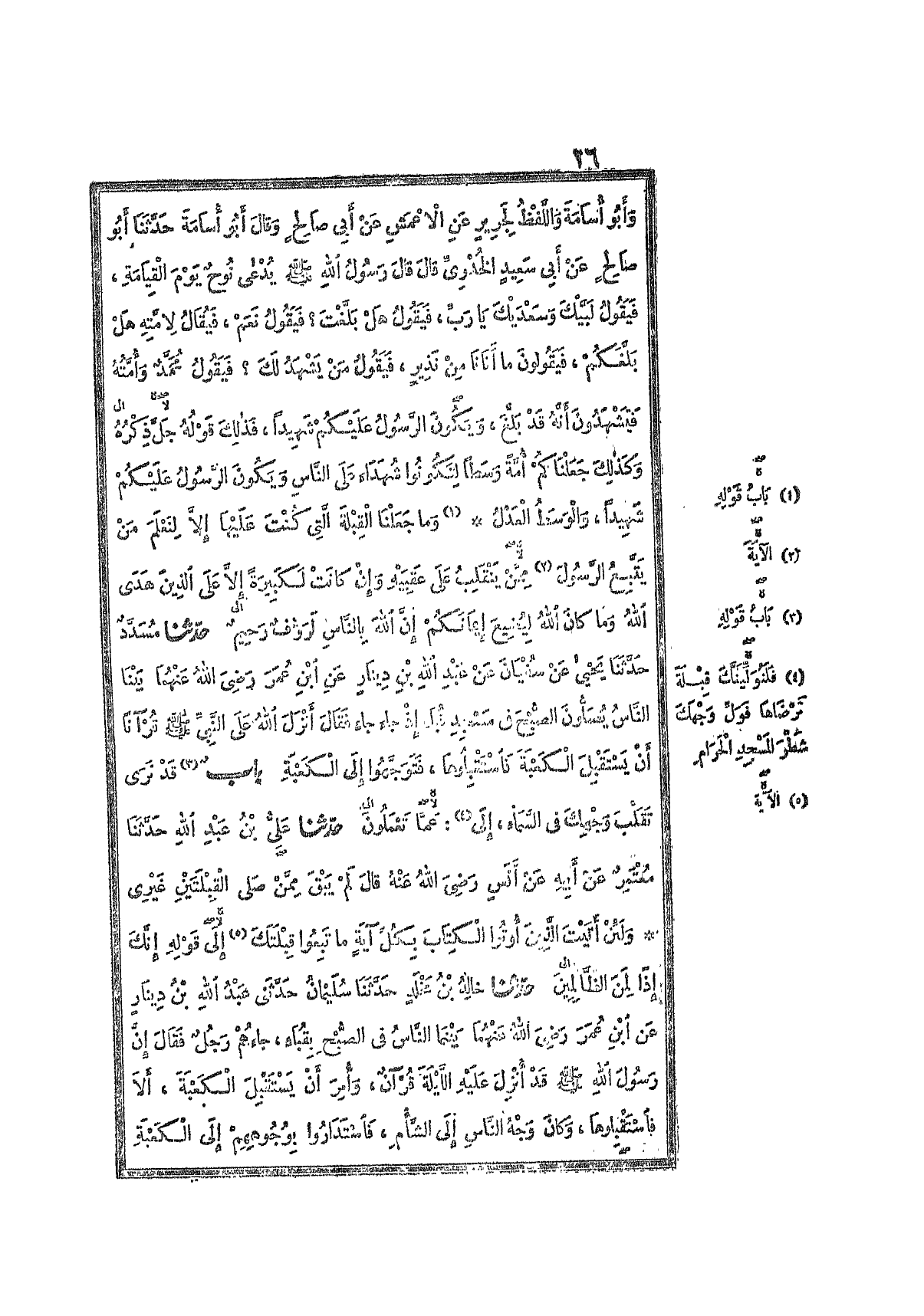 4490 - حَدَّثَنَا خَالِدُ بْنُ مَخْلَدٍ، حَدَّثَنَا سُلَيْمَانُ، حَدَّثَنِي عَبْدُ اللهِ بْنُ دِينَارٍ، عَنِ ابْنِ عُمَرَ، رَضِيَ اللَّهُ عَنْهُمَا، بَيْنَمَا النَّاسُ فِي الصُّبْحِ بِقُبَاءٍ، جَاءَهُمْ رَجُلٌ , فَقَالَ: إِنَّ رَسُولَ اللهِ صَلَّى اللَّهُ عَلَيْهِ وَسَلَّمَ قَدْ أُنْزِلَ عَلَيْهِ اللَّيْلَةَ قُرْآنٌ، وَأُمِرَ أَنْ يَسْتَقْبِلَ الكَعْبَةَ، أَلاَ فَاسْتَقْبِلُوهَا، وَكَانَ وَجْهُ النَّاسِ إِلَى الشَّامِ، فَاسْتَدَارُوا بِوُجُوهِهِمْ إِلَى الكَعْبَةِ.