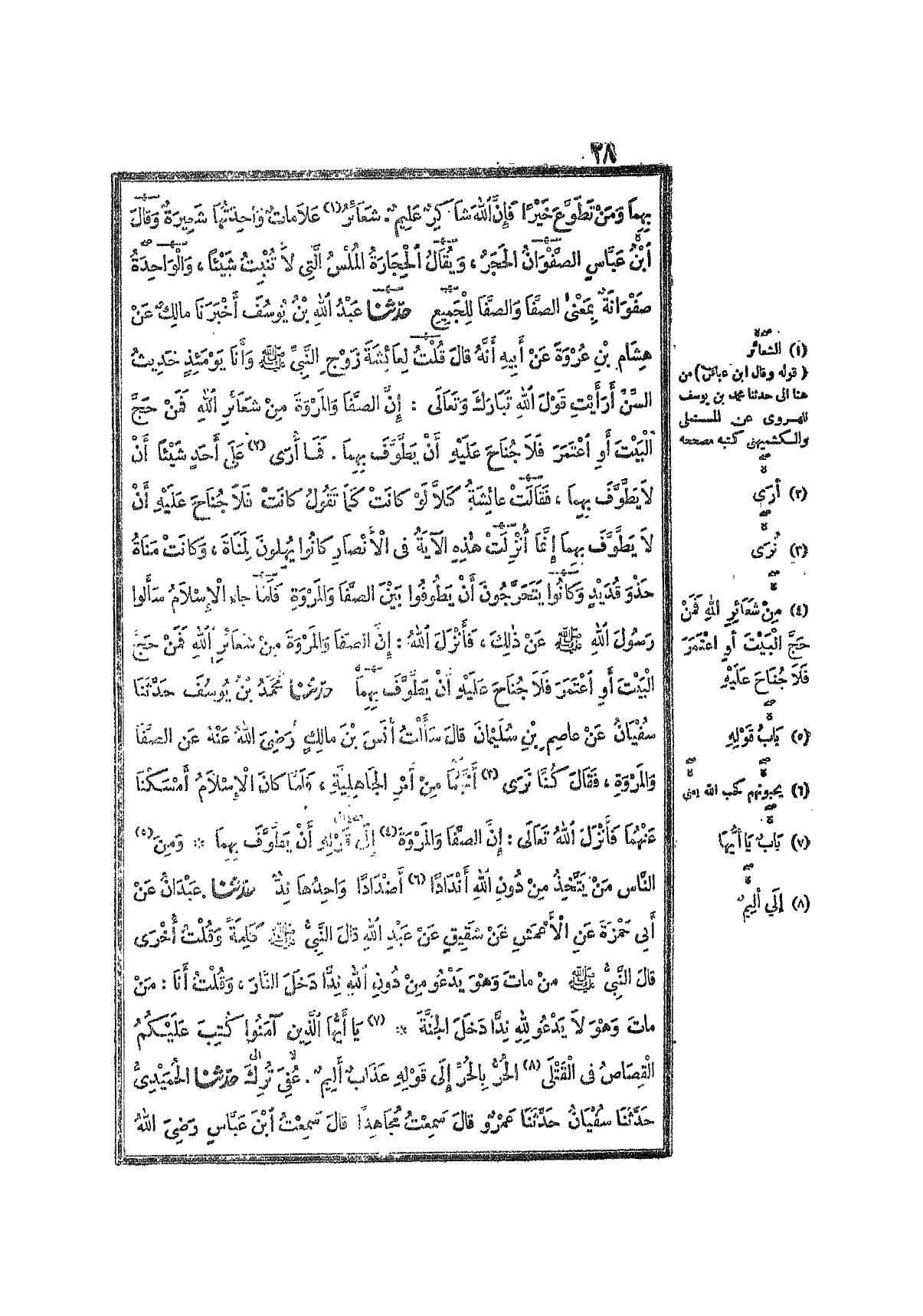 4496- حَدَّثَنَا مُحَمَّدُ بْنُ يُوسُفَ ، حَدَّثَنَا سُفْيَانُ ، عَنْ عَاصِمِ بْنِ سُلَيْمَانَ ، قَالَ : سَأَلْتُ أَنَسَ بْنَ مَالِكٍ ، رَضِيَ اللَّهُ عَنْهُ ، عَنِ الصَّفَا ، وَالمَرْوَةِ , فَقَالَ : كُنَّا نَرَى أَنَّهُمَا مِنْ أَمْرِ الجَاهِلِيَّةِ ، فَلَمَّا كَانَ الإِسْلاَمُ , أَمْسَكْنَا عَنْهُمَا , فَأَنْزَلَ اللَّهُ تَعَالَى : {إِنَّ الصَّفَا وَالمَرْوَةَ} إِلَى قَوْلِهِ : {أَنْ يَطَّوَّفَ بِهِمَا}.