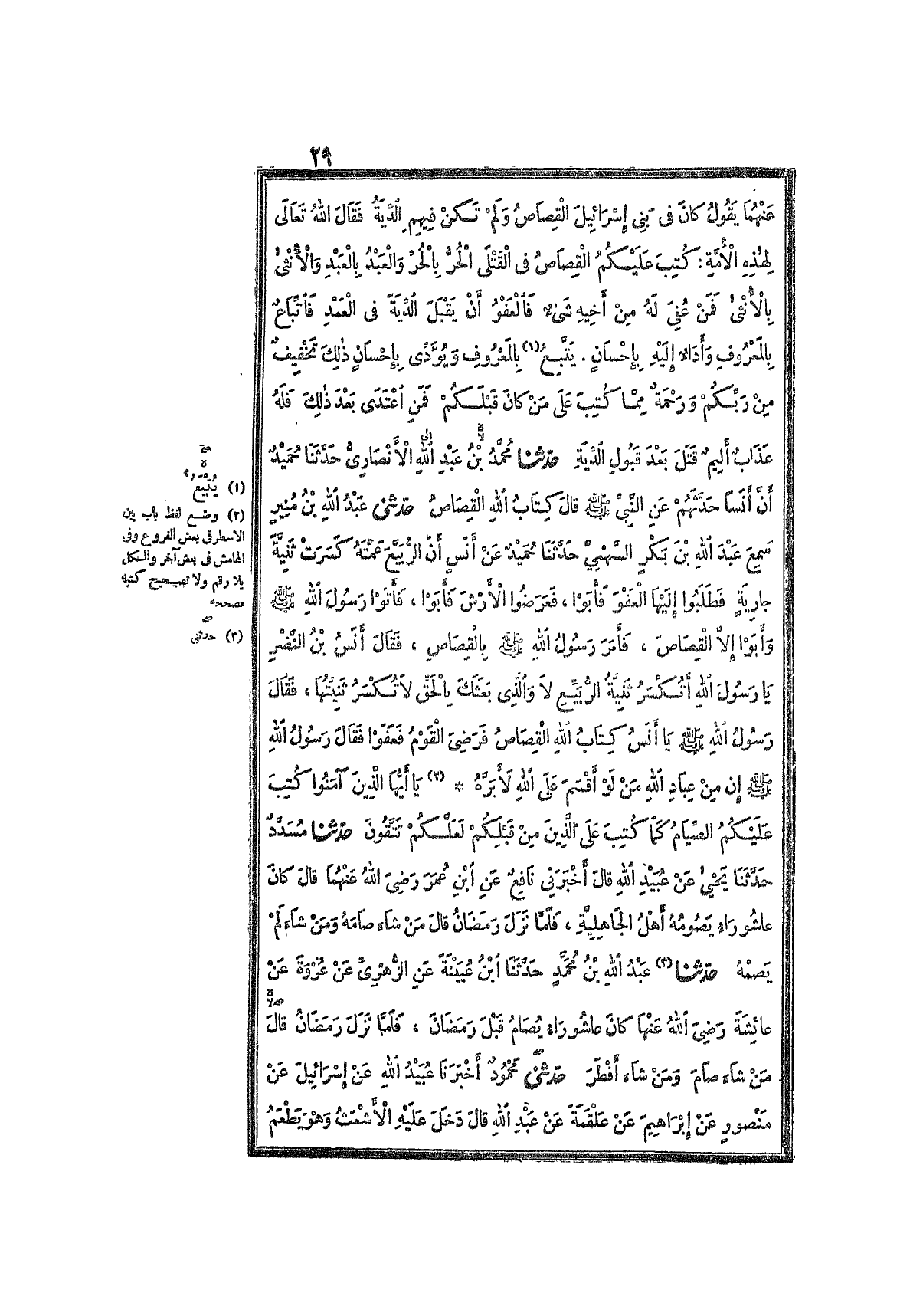 4499 - حَدَّثَنَا مُحَمَّدُ بْنُ عَبْدِ اللهِ الأَنْصَارِيُّ، حَدَّثَنَا حُمَيْدٌ، أَنَّ أَنَسًا حَدَّثَهُمْ عَنِ النَّبِيِّ صَلَّى اللَّهُ عَلَيْهِ وَسَلَّمَ، قَالَ: كِتَابُ اللهِ القِصَاصُ.