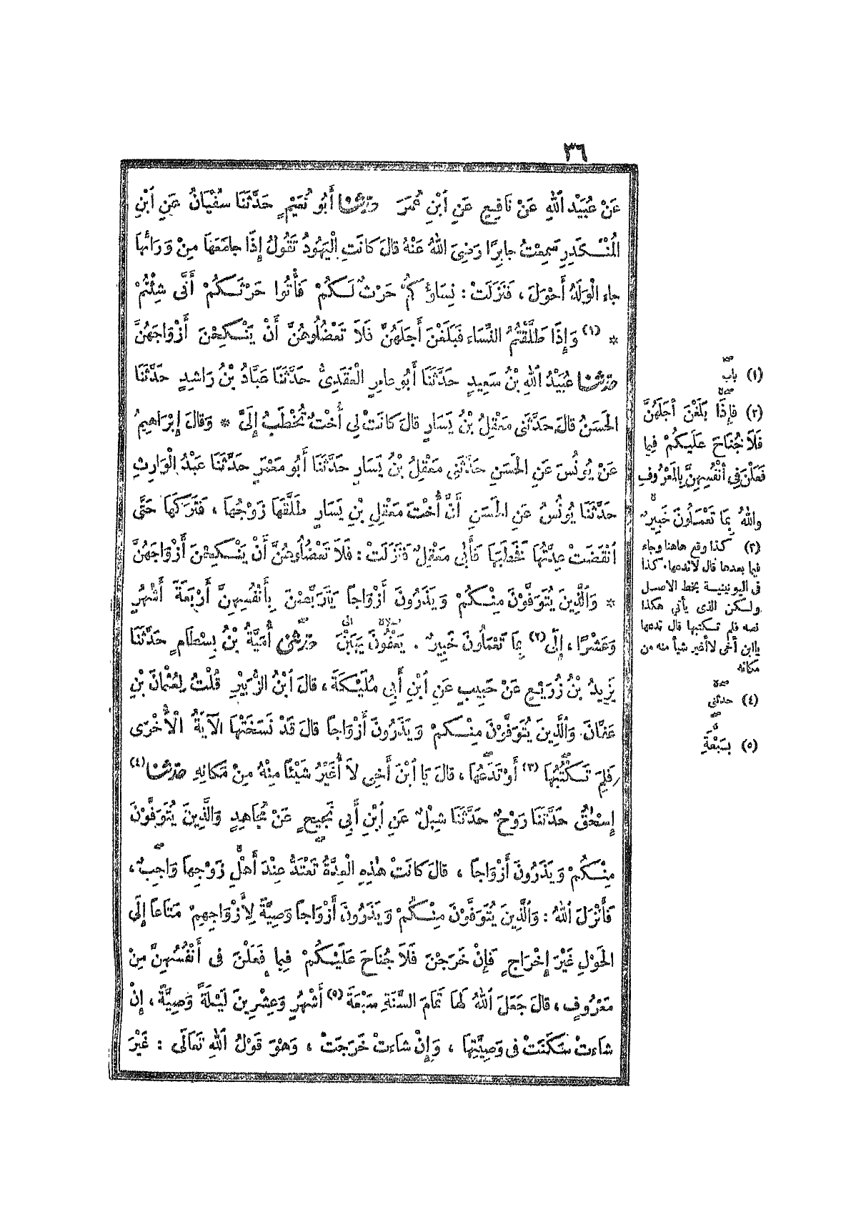 4531- حَدَّثَنَا إِسْحَاقُ ، حَدَّثَنَا رَوْحٌ ، حَدَّثَنَا شِبْلٌ ، عَنِ ابْنِ أَبِي نَجِيحٍ ، عَنْ مُجَاهِدٍ : {وَالَّذِينَ يُتَوَفَّوْنَ مِنْكُمْ وَيَذَرُونَ أَزْوَاجًا} قَالَ : كَانَتْ هَذِهِ العِدَّةُ ، تَعْتَدُّ عِنْدَ أَهْلِ زَوْجِهَا وَاجِبٌ ، فَأَنْزَلَ اللَّهُ : {وَالَّذِينَ يُتَوَفَّوْنَ مِنْكُمْ وَيَذَرُونَ أَزْوَاجًا وَصِيَّةً لأَزْوَاجِهِمْ مَتَاعًا إِلَى الحَوْلِ غَيْرَ إِخْرَاجٍ فَإِنْ خَرَجْنَ فَلاَ جُنَاحَ عَلَيْكُمْ فِيمَا فَعَلْنَ فِي أَنْفُسِهِنَّ مِنْ مَعْرُوفٍ} قَالَ : جَعَلَ اللَّهُ لَهَا تَمَامَ السَّنَةِ سَبْعَةَ أَشْهُرٍ وَعِشْرِينَ لَيْلَةً وَصِيَّةً ، إِنْ شَاءَتْ سَكَنَتْ فِي وَصِيَّتِهَا ، وَإِنْ شَاءَتْ خَرَجَتْ ، وَهْوَ قَوْلُ اللهِ تَعَالَى : {غَيْرَ إِخْرَاجٍ فَإِنْ خَرَجْنَ فَلاَ جُنَاحَ عَلَيْكُمْ} فَالعِدَّةُ كَمَا هِيَ وَاجِبٌ عَلَيْهَا , زَعَمَ ذَلِكَ عَنْ مُجَاهِدٍ.