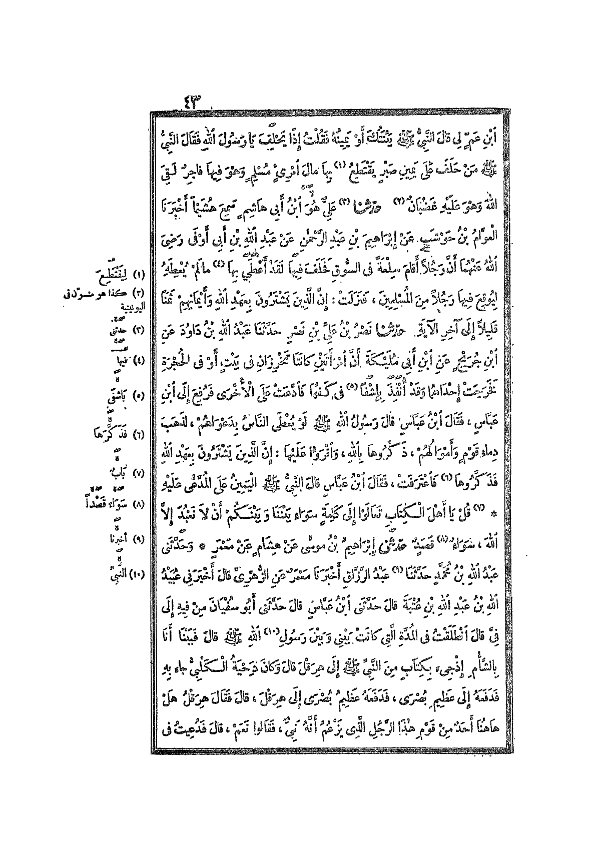 4553 - حَدَّثَنِي إِبْرَاهِيمُ بْنُ مُوسَى، عَنْ هِشَامٍ، عَنْ مَعْمَرٍ (ح) وَحَدَّثَنِي عَبْدُ اللهِ بْنُ مُحَمَّدٍ، حَدَّثَنَا عَبْدُ الرَّزَّاقِ، أَخْبَرَنَا مَعْمَرٌ، عَنِ الزُّهْرِيِّ، قَالَ: أَخْبَرَنِي عُبَيْدُ اللهِ بْنُ عَبْدِ اللهِ بْنِ عُتْبَةَ، قَالَ: حَدَّثَنِي ابْنُ عَبَّاسٍ، قَالَ: حَدَّثَنِي أَبُو سُفْيَانَ مِنْ فِيهِ إِلَى فِيَّ، قَالَ: انْطَلَقْتُ فِي المُدَّةِ الَّتِي كَانَتْ بَيْنِي وَبَيْنَ رَسُولِ اللهِ صَلَّى اللَّهُ عَلَيْهِ وَسَلَّمَ، قَالَ: قَالَ: فَبَيْنَا أَنَا بِالشَّامِ، إِذْ جِيءَ بِكِتَابٍ مِنَ النَّبِيِّ صَلَّى اللَّهُ عَلَيْهِ وَسَلَّمَ إِلَى هِرَقْلَ، قَالَ: وَكَانَ دِحْيَةُ الكَلْبِيُّ جَاءَ بِهِ، فَدَفَعَهُ إِلَى عَظِيمِ بُصْرَى، فَدَفَعَهُ عَظِيمُ بُصْرَى إِلَى هِرَقْلَ، قَالَ: فَقَالَ هِرَقْلُ: هَلْ هَاهُنَا أَحَدٌ مِنْ قَوْمِ هَذَا الرَّجُلِ الَّذِي يَزْعُمُ أَنَّهُ نَبِيٌّ؟ فَقَالُوا: نَعَمْ، قَالَ: فَدُعِيتُ فِي نَفَرٍ مِنْ قُرَيْشٍ، فَدَخَلْنَا عَلَى هِرَقْلَ , فَأَجْلَسْنَا بَيْنَ يَدَيْهِ، فَقَالَ: أَيُّكُمْ أَقْرَبُ نَسَبًا مِنْ هَذَا الرَّجُلِ الَّذِي يَزْعُمُ أَنَّهُ نَبِيٌّ؟ فَقَالَ أَبُو سُفْيَانَ: فَقُلْتُ: أَنَا , فَأَجْلَسُونِي بَيْنَ يَدَيْهِ، وَأَجْلَسُوا أَصْحَابِي خَلْفِي، ثُمَّ دَعَا بِتَرْجُمَانِهِ، فَقَالَ: قُلْ لَهُمْ: إِنِّي سَائِلٌ هَذَا عَنْ هَذَا الرَّجُلِ الَّذِي يَزْعُمُ أَنَّهُ نَبِيٌّ، فَإِنْ كَذَبَنِي , فَكَذِّبُوهُ، قَالَ أَبُو سُفْيَانَ: وَايْمُ اللهِ، لَوْلاَ أَنْ يُؤْثِرُوا عَلَيَّ الكَذِبَ لَكَذَبْتُ، ثُمَّ قَالَ لِتَرْجُمَانِهِ: سَلْهُ كَيْفَ حَسَبُهُ فِيكُمْ؟ قَالَ: قُلْتُ: هُوَ فِينَا ذُو حَسَبٍ، قَالَ: فَهَلْ كَانَ مِنْ آبَائِهِ مَلِكٌ؟ قَالَ: قُلْتُ: لاَ، قَالَ: فَهَلْ كُنْتُمْ تَتَّهِمُونَهُ بِالكَذِبِ قَبْلَ أَنْ يَقُولَ مَا قَالَ؟ قُلْتُ: لاَ، قَالَ: أَيَتَّبِعُهُ أَشْرَافُ النَّاسِ أَمْ ضُعَفَاؤُهُمْ؟