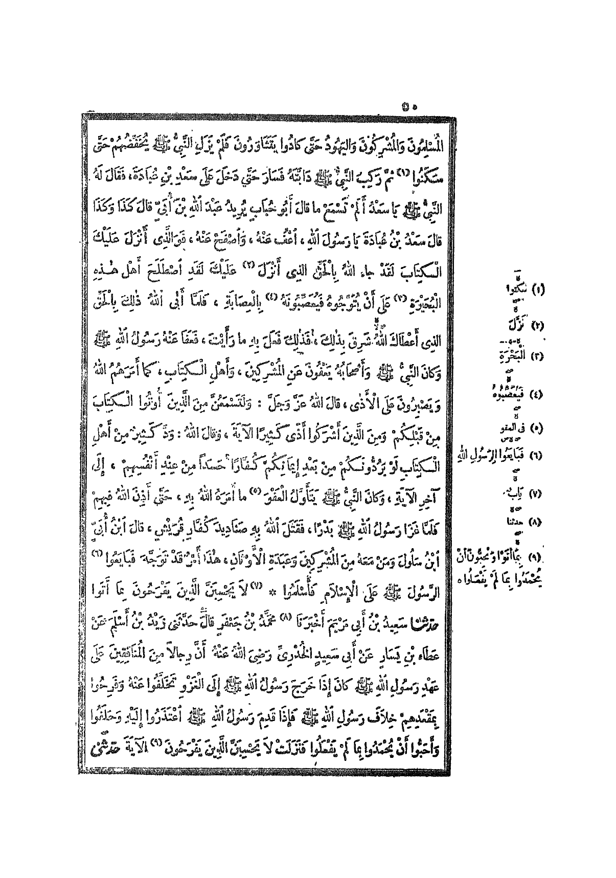 فَلَمْ يَزَلِ النَّبِيُّ صَلَّى اللَّهُ عَلَيْهِ وَسَلَّمَ يُخَفِّضُهُمْ حَتَّى سَكَنُوا، ثُمَّ رَكِبَ النَّبِيُّ صَلَّى اللَّهُ عَلَيْهِ وَسَلَّمَ دَابَّتَهُ , فَسَارَ حَتَّى دَخَلَ عَلَى سَعْدِ بْنِ عُبَادَةَ، فَقَالَ لَهُ النَّبِيُّ صَلَّى اللَّهُ عَلَيْهِ وَسَلَّمَ: يَا سَعْدُ , أَلَمْ تَسْمَعْ مَا قَالَ أَبُو حُبَابٍ؟ يُرِيدُ عَبْدَ اللهِ بْنَ أُبَيٍّ، قَالَ: كَذَا وَكَذَا، قَالَ سَعْدُ بْنُ عُبَادَةَ: يَا رَسُولَ اللهِ، اعْفُ عَنْهُ وَاصْفَحْ عَنْهُ، فَوَالَّذِي أَنْزَلَ عَلَيْكَ الكِتَابَ , لَقَدْ جَاءَ اللَّهُ بِالحَقِّ الَّذِي أَنْزَلَ عَلَيْكَ، وَلَقَدِ اصْطَلَحَ أَهْلُ هَذِهِ البُحَيْرَةِ عَلَى أَنْ يُتَوِّجُوهُ فَيُعَصِّبُونَهُ بِالعِصَابَةِ، فَلَمَّا أَبَى اللَّهُ ذَلِكَ بِالحَقِّ الَّذِي أَعْطَاكَ اللَّهُ شَرِقَ بِذَلِكَ، فَذَلِكَ فَعَلَ بِهِ مَا رَأَيْتَ، فَعَفَا عَنْهُ رَسُولُ اللهِ صَلَّى اللَّهُ عَلَيْهِ وَسَلَّمَ، وَكَانَ النَّبِيُّ صَلَّى اللَّهُ عَلَيْهِ وَسَلَّمَ وَأَصْحَابُهُ يَعْفُونَ عَنِ المُشْرِكِينَ، وَأَهْلِ الكِتَابِ كَمَا أَمَرَهُمُ اللَّهُ، وَيَصْبِرُونَ عَلَى الأَذَى، قَالَ اللَّهُ عَزَّ وَجَلَّ: {وَلَتَسْمَعُنَّ مِنَ الَّذِينَ أُوتُوا الكِتَابَ مِنْ قَبْلِكُمْ وَمِنَ الَّذِينَ أَشْرَكُوا أَذًى كَثِيرًا} الآيَةَ، وَقَالَ اللَّهُ: {وَدَّ كَثِيرٌ مِنْ أَهْلِ الكِتَابِ لَوْ يَرُدُّونَكُمْ مِنْ بَعْدِ إِيمَانِكُمْ كُفَّارًا حَسَدًا مِنْ عِنْدِ أَنْفُسِهِمْ} إِلَى آخِرِ الآيَةِ، وَكَانَ النَّبِيُّ صَلَّى اللَّهُ عَلَيْهِ وَسَلَّمَ يَتَأَوَّلُ العَفْوَ مَا أَمَرَهُ اللَّهُ بِهِ، حَتَّى أَذِنَ اللَّهُ فِيهِمْ، فَلَمَّا غَزَا رَسُولُ اللهِ صَلَّى اللَّهُ عَلَيْهِ وَسَلَّمَ بَدْرًا، فَقَتَلَ اللَّهُ بِهِ صَنَادِيدَ كُفَّارِ قُرَيْشٍ، قَالَ ابْنُ أُبَيٍّ ابْنُ سَلُولَ وَمَنْ مَعَهُ مِنَ المُشْرِكِينَ وَعَبَدَةِ الأَوْثَانِ: هَذَا أَمْرٌ قَدْ تَوَجَّهَ، فَبَايَعُوا الرَّسُولَ صَلَّى اللَّهُ عَلَيْهِ وَسَلَّمَ عَلَى الإِسْلاَمِ , فَأَسْلَمُوا.