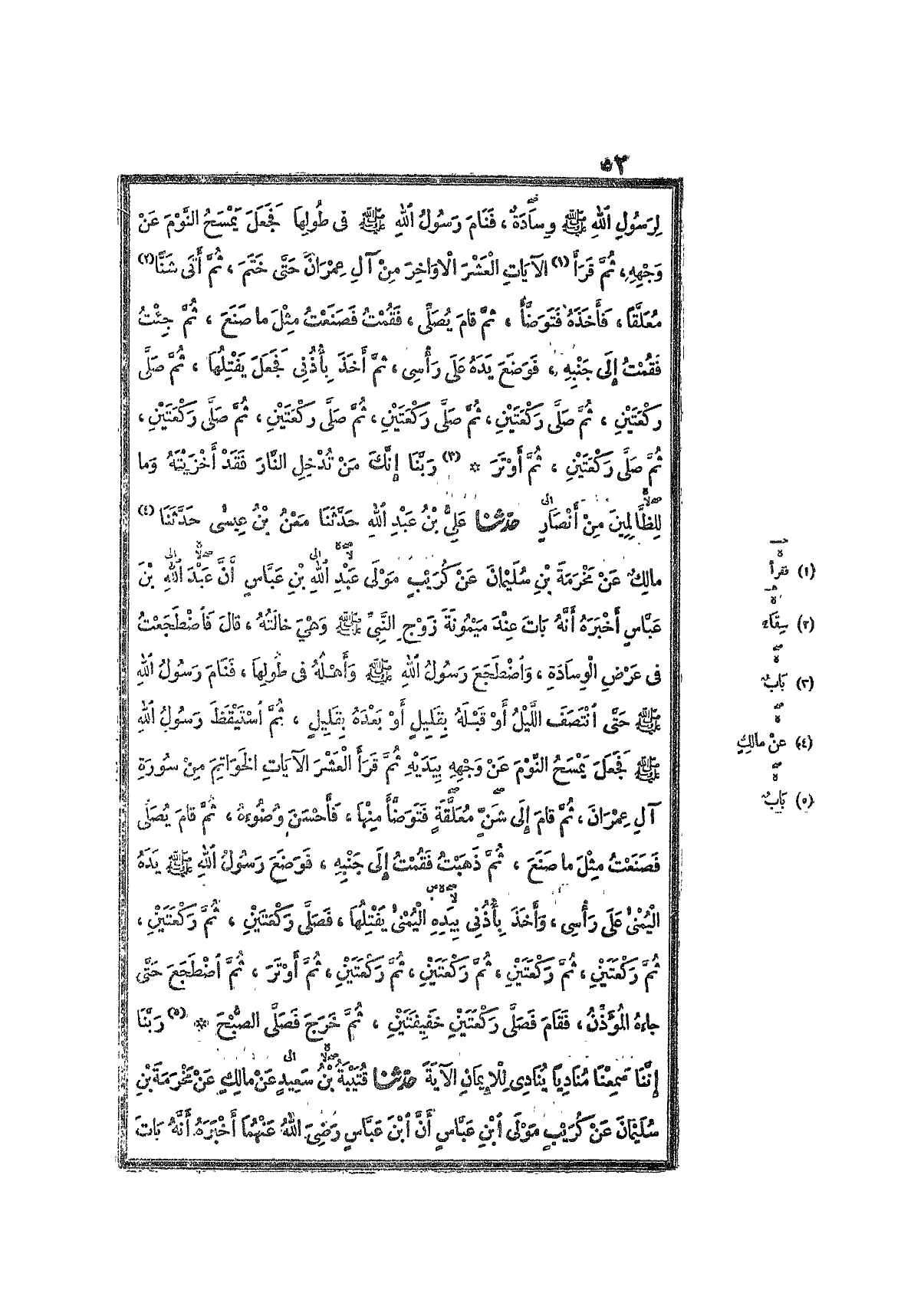 4572- حَدَّثَنَا قُتَيْبَةُ بْنُ سَعِيدٍ ، عَنْ مَالِكٍ ، عَنْ مَخْرَمَةَ بْنِ سُلَيْمَانَ ، عَنْ كُرَيْبٍ مَوْلَى ابْنِ عَبَّاسٍ ، أَنَّ ابْنَ عَبَّاسٍ ، رَضِيَ اللَّهُ عَنْهُمَا أَخْبَرَهُ : أَنَّهُ بَاتَ عِنْدَ مَيْمُونَةَ زَوْجِ النَّبِيِّ صَلَّى اللَّهُ عَلَيْهِ وَسَلَّمَ ، وَهْيَ خَالَتُهُ , قَالَ : فَاضْطَجَعْتُ فِي عَرْضِ الوِسَادَةِ ، وَاضْطَجَعَ رَسُولُ اللهِ صَلَّى اللَّهُ عَلَيْهِ وَسَلَّمَ وَأَهْلُهُ فِي طُولِهَا ، فَنَامَ رَسُولُ اللهِ صَلَّى اللَّهُ عَلَيْهِ وَسَلَّمَ حَتَّى إِذَا انْتَصَفَ اللَّيْلُ ، أَوْ قَبْلَهُ بِقَلِيلٍ ، أَوْ بَعْدَهُ بِقَلِيلٍ ، اسْتَيْقَظَ رَسُولُ اللهِ صَلَّى اللَّهُ عَلَيْهِ وَسَلَّمَ , فَجَعَلَ يَمْسَحُ النَّوْمَ عَنْ وَجْهِهِ بِيَدِهِ , ثُمَّ قَرَأَ العَشْرَ الآيَاتِ الخَوَاتِمَ مِنْ سُورَةِ آلِ عِمْرَانَ ، ثُمَّ قَامَ إِلَى شَنٍّ مُعَلَّقَةٍ فَتَوَضَّأَ مِنْهَا ، فَأَحْسَنَ وُضُوءَهُ ، ثُمَّ قَامَ يُصَلِّي ، قَالَ ابْنُ عَبَّاسٍ : فَقُمْتُ فَصَنَعْتُ مِثْلَ مَا صَنَعَ ، ثُمَّ ذَهَبْتُ فَقُمْتُ إِلَى جَنْبِهِ , فَوَضَعَ رَسُولُ اللهِ صَلَّى اللَّهُ عَلَيْهِ وَسَلَّمَ يَدَهُ اليُمْنَى عَلَى رَأْسِي ، وَأَخَذَ بِأُذُنِي اليُمْنَى يَفْتِلُهَا ، فَصَلَّى رَكْعَتَيْنِ ، ثُمَّ رَكْعَتَيْنِ ، ثُمَّ رَكْعَتَيْنِ ، ثُمَّ رَكْعَتَيْنِ ، ثُمَّ رَكْعَتَيْنِ ، ثُمَّ رَكْعَتَيْنِ ، ثُمَّ أَوْتَرَ ، ثُمَّ اضْطَجَعَ حَتَّى جَاءَهُ المُؤَذِّنُ ، فَقَامَ فَصَلَّى رَكْعَتَيْنِ خَفِيفَتَيْنِ ، ثُمَّ خَرَجَ فَصَلَّى الصُّبْحَ.