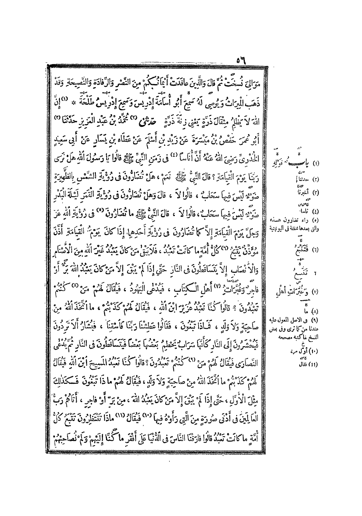 4581 - حَدَّثَنَا مُحَمَّدُ بْنُ عَبْدِ العَزِيزِ، أَخْبَرَنَا أَبُو عُمَرَ حَفْصُ بْنُ مَيْسَرَةَ، عَنْ زَيْدِ بْنِ أَسْلَمَ، عَنْ عَطَاءِ بْنِ يَسَارٍ، عَنْ أَبِي سَعِيدٍ الخُدْرِيِّ، رَضِيَ اللَّهُ عَنْهُ؛ أَنَّ أُنَاسًا فِي زَمَنِ النَّبِيِّ صَلَّى اللَّهُ عَلَيْهِ وَسَلَّمَ , قَالُوا: يَا رَسُولَ اللهِ , هَلْ نَرَى رَبَّنَا يَوْمَ القِيَامَةِ؟ قَالَ النَّبِيُّ صَلَّى اللَّهُ عَلَيْهِ وَسَلَّمَ: نَعَمْ، هَلْ تُضَارُّونَ فِي رُؤْيَةِ الشَّمْسِ بِالظَّهِيرَةِ ضَوْءٌ لَيْسَ فِيهَا سَحَابٌ؟ قَالُوا: لاَ، قَالَ: وَهَلْ تُضَارُّونَ فِي رُؤْيَةِ القَمَرِ لَيْلَةَ البَدْرِ ضَوْءٌ لَيْسَ فِيهَا سَحَابٌ؟ قَالُوا: لاَ، قَالَ النَّبِيُّ صَلَّى اللَّهُ عَلَيْهِ وَسَلَّمَ: مَا تُضَارُونَ فِي رُؤْيَةِ اللهِ عَزَّ وَجَلَّ يَوْمَ القِيَامَةِ، إِلاَّ كَمَا تُضَارُونَ فِي رُؤْيَةِ أَحَدِهِمَا، إِذَا كَانَ يَوْمُ القِيَامَةِ أَذَّنَ مُؤَذِّنٌ: تَتْبَعُ كُلُّ أُمَّةٍ مَا كَانَتْ تَعْبُدُ، فَلاَ يَبْقَى مَنْ كَانَ يَعْبُدُ غَيْرَ اللهِ مِنَ الأَصْنَامِ وَالأَنْصَابِ، إِلاَّ يَتَسَاقَطُونَ فِي النَّارِ، حَتَّى إِذَا لَمْ يَبْقَ إِلاَّ مَنْ كَانَ يَعْبُدُ اللَّهَ بَرٌّ أَوْ فَاجِرٌ، وَغُبَّرَاتُِ أَهْلِ الكِتَابِ , فَيُدْعَى اليَهُودُ , فَيُقَالُ لَهُمْ: مَنْ كُنْتُمْ تَعْبُدُونَ؟ قَالُوا: كُنَّا نَعْبُدُ عُزَيْرَ ابْنَ اللهِ , فَيُقَالُ لَهُمْ: كَذَبْتُمْ , مَا اتَّخَذَ اللَّهُ مِنْ صَاحِبَةٍ، وَلاَ وَلَدٍ، فَمَاذَا تَبْغُونَ؟ فَقَالُوا: عَطِشْنَا رَبَّنَا فَاسْقِنَا، فَيُشَارُ أَلاَ تَرِدُونَ , فَيُحْشَرُونَ إِلَى النَّارِ , كَأَنَّهَا سَرَابٌ يَحْطِمُ بَعْضُهَا بَعْضًا , فَيَتَسَاقَطُونَ فِي النَّارِ، ثُمَّ يُدْعَى النَّصَارَى , فَيُقَالُ لَهُمْ: مَنْ كُنْتُمْ تَعْبُدُونَ؟ قَالُوا: كُنَّا نَعْبُدُ المَسِيحَ ابْنَ اللهِ، فَيُقَالُ لَهُمْ: كَذَبْتُمْ، مَا اتَّخَذَ اللَّهُ مِنْ صَاحِبَةٍ، وَلاَ وَلَدٍ، فَيُقَالُ لَهُمْ: مَاذَا تَبْغُونَ؟ فَكَذَلِكَ مِثْلَ الأَوَّلِ , حَتَّى إِذَا لَمْ يَبْقَ إِلاَّ مَنْ كَانَ يَعْبُدُ اللَّهَ مِنْ بَرٍّ، أَوْ فَاجِرٍ، أَتَاهُمْ رَبُّ العَالَمِينَ فِي أَدْنَى صُورَةٍ مِنَ الَّتِي رَأَوْهُ فِيهَا، فَيُقَالُ: مَاذَا تَنْتَظِرُونَ , تَتْبَعُ كُلُّ أُمَّةٍ مَا كَانَتْ تَعْبُدُ، قَالُوا: فَارَقْنَا النَّاسَ فِي الدُّنْيَا عَلَى أَفْقَرِ مَا كُنَّا إِلَيْهِمْ وَلَمْ نُصَاحِبْهُمْ، وَنَحْنُ نَنْتَظِرُ رَبَّنَا الَّذِي كُنَّا نَعْبُدُ، فَيَقُولُ: أَنَا رَبُّكُمْ، فَيَقُولُونَ: لاَ نُشْرِكُ بِاللهِ شَيْئًا، مَرَّتَيْنِ أَوْ ثَلاَثًا.