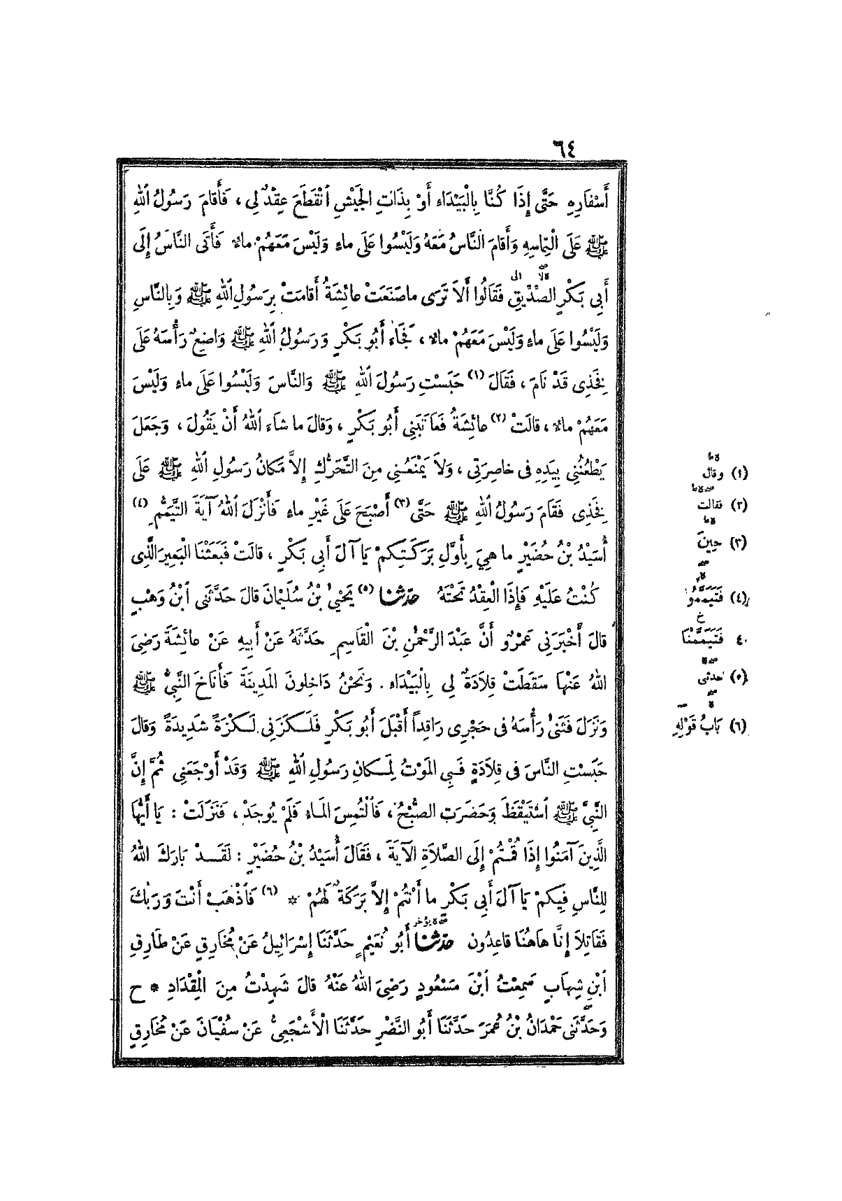 وَلَيْسُوا عَلَى مَاءٍ ، وَلَيْسَ مَعَهُمْ مَاءٌ ، فَأَتَى النَّاسُ إِلَى أَبِي بَكْرٍ الصِّدِّيقِ ، فَقَالُوا : أَلاَ تَرَى مَا صَنَعَتْ عَائِشَةُ ، أَقَامَتْ بِرَسُولِ اللهِ صَلَّى اللَّهُ عَلَيْهِ وَسَلَّمَ وَبِالنَّاسِ ، وَلَيْسُوا عَلَى مَاءٍ ، وَلَيْسَ مَعَهُمْ مَاءٌ ؟ فَجَاءَ أَبُو بَكْرٍ , وَرَسُولُ اللهِ صَلَّى اللَّهُ عَلَيْهِ وَسَلَّمَ وَاضِعٌ رَأْسَهُ عَلَى فَخِذِي قَدْ نَامَ ، فَقَالَ : حَبَسْتِ رَسُولَ اللهِ صَلَّى اللَّهُ عَلَيْهِ وَسَلَّمَ , وَالنَّاسَ لَيْسُوا عَلَى مَاءٍ , وَلَيْسَ مَعَهُمْ مَاءٌ ، قَالَتْ عَائِشَةُ : فَعَاتَبَنِي أَبُو بَكْرٍ ، وَقَالَ مَا شَاءَ اللَّهُ أَنْ يَقُولَ , وَجَعَلَ يَطْعُنُنِي بِيَدِهِ فِي خَاصِرَتِي ، وَلاَ يَمْنَعُنِي مِنَ التَّحَرُّكِ إِلاَّ مَكَانُ رَسُولِ اللهِ صَلَّى اللَّهُ عَلَيْهِ وَسَلَّمَ عَلَى فَخِذِي ، فَقَامَ رَسُولُ اللهِ صَلَّى اللَّهُ عَلَيْهِ وَسَلَّمَ حَتَّى أَصْبَحَ عَلَى غَيْرِ مَاءٍ , فَأَنْزَلَ اللَّهُ آيَةَ التَّيَمُّمِ , فَقَالَ أُسَيْدُ بْنُ حُضَيْرٍ : مَا هِيَ بِأَوَّلِ بَرَكَتِكُمْ يَا آلَ أَبِي بَكْرٍ ، قَالَتْ : فَبَعَثْنَا البَعِيرَ الَّذِي كُنْتُ عَلَيْهِ , فَإِذَا العِقْدُ تَحْتَهُ.