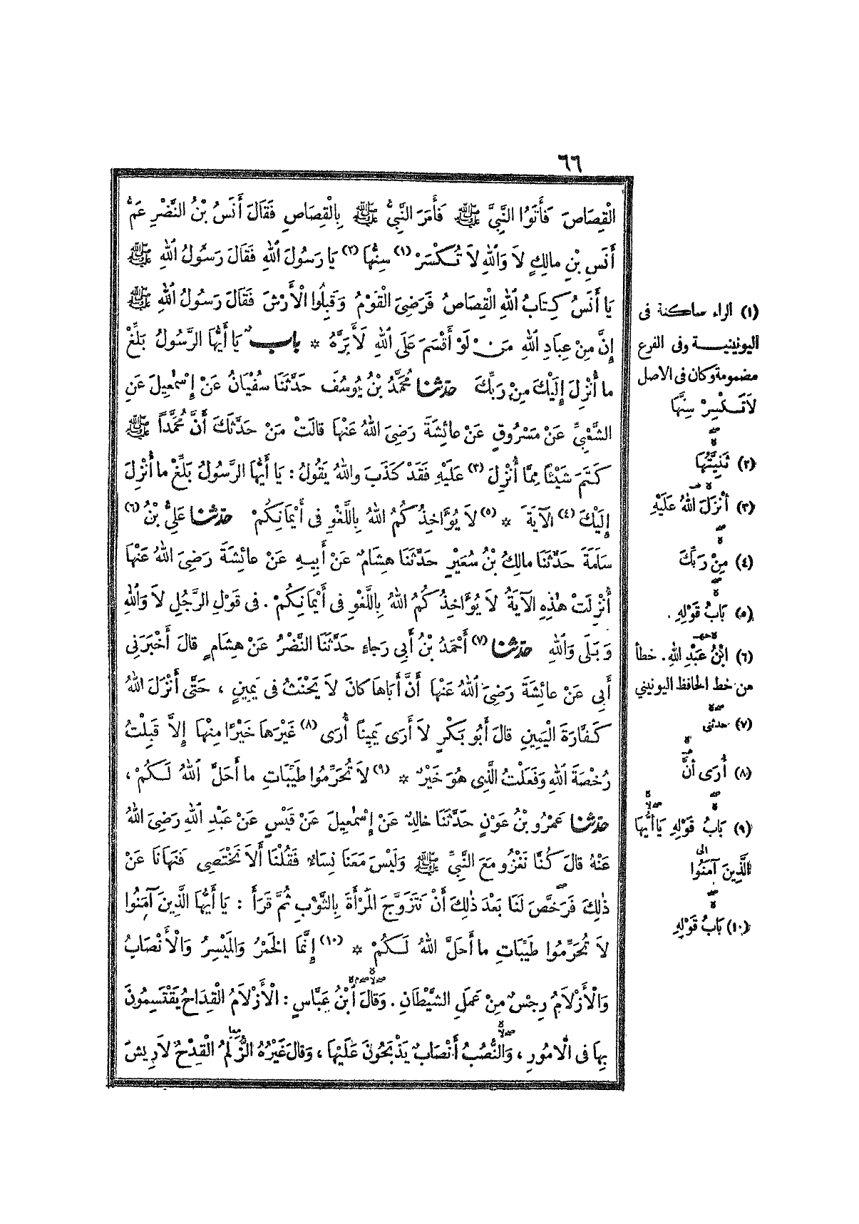 4615- حَدَّثَنَا عَمْرُو بْنُ عَوْنٍ ، حَدَّثَنَا خَالِدٌ ، عَنْ إِسْمَاعِيلَ ، عَنْ قَيْسٍ ، عَنْ عَبْدِ اللهِ ، رَضِيَ اللَّهُ عَنْهُ ، قَالَ : كُنَّا نَغْزُو مَعَ النَّبِيِّ صَلَّى اللَّهُ عَلَيْهِ وَسَلَّمَ , وَلَيْسَ مَعَنَا نِسَاءٌ ، فَقُلْنَا : أَلاَ نَخْتَصِي ؟ فَنَهَانَا عَنْ ذَلِكَ ، فَرَخَّصَ لَنَا بَعْدَ ذَلِكَ أَنْ نَتَزَوَّجَ المَرْأَةَ بِالثَّوْبِ , ثُمَّ قَرَأَ : {يَا أَيُّهَا الَّذِينَ آمَنُوا لاَ تُحَرِّمُوا طَيِّبَاتِ مَا أَحَلَّ اللَّهُ لَكُمْ}.