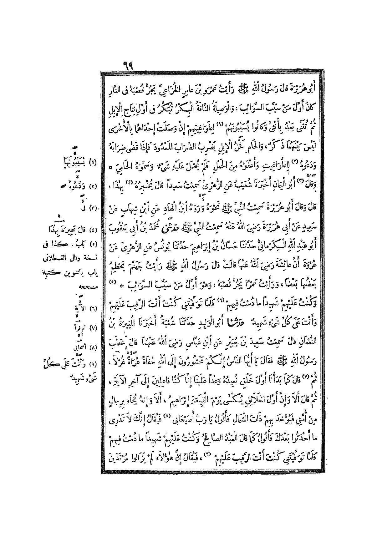 قَالَ : وَقَالَ أَبُو هُرَيْرَةَ : قَالَ رَسُولُ اللهِ صَلَّى اللَّهُ عَلَيْهِ وَسَلَّمَ : رَأَيْتُ عَمْرَو بْنَ عَامِرٍ الخُزَاعِيَّ يَجُرُّ قُصْبَهُ فِي النَّارِ ، كَانَ أَوَّلَ مَنْ سَيَّبَ السَّوَائِبَ وَالوَصِيلَةُ : النَّاقَةُ البِكْرُ ، تُبَكِّرُ فِي أَوَّلِ نِتَاجِ الإِبِلِ بِأُنْثَى ، ثُمَّ تُثَنِّي بَعْدُ بِأُنْثَى ، وَكَانُوا يُسَيِّبُونَهُم لِطَوَاغِيتِهِمْ ، إِنْ وَصَلَتْ إِحْدَاهُمَا بِالأُخْرَى لَيْسَ بَيْنَهُمَا ذَكَرٌ ، وَالحَامِ : فَحْلُ الإِبِلِ يَضْرِبُ الضِّرَابَ المَعْدُودَ ، فَإِذَا قَضَى ضِرَابَهُ وَدَعُوهُ لِلطَّوَاغِيتِ ، وَأَعْفَوْهُ مِنَ الحَمْلِ ، فَلَمْ يُحْمَلْ عَلَيْهِ شَيْءٌ , وَسَمَّوْهُ الحَامِيَ.