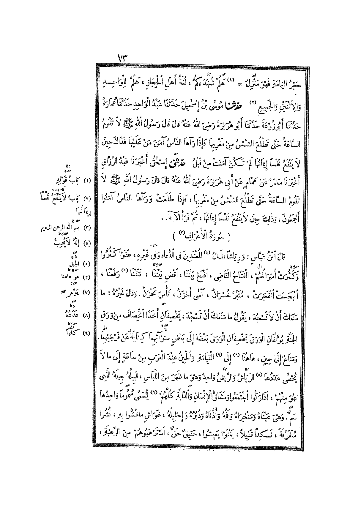 4635- حَدَّثَنَا مُوسَى بْنُ إِسْمَاعِيلَ ، حَدَّثَنَا عَبْدُ الوَاحِدِ ، حَدَّثَنَا عُمَارَةُ ، حَدَّثَنَا أَبُو زُرْعَةَ ، حَدَّثَنَا أَبُو هُرَيْرَةَ ، رَضِيَ اللَّهُ عَنْهُ ، قَالَ : قَالَ رَسُولُ اللهِ صَلَّى اللَّهُ عَلَيْهِ وَسَلَّمَ : لاَ تَقُومُ السَّاعَةُ حَتَّى تَطْلُعَ الشَّمْسُ مِنْ مَغْرِبِهَا ، فَإِذَا رَآهَا النَّاسُ آمَنَ مَنْ عَلَيْهَا , فَذَاكَ حِينَ : {لاَ يَنْفَعُ نَفْسًا إِيمَانُهَا لَمْ تَكُنْ آمَنَتْ مِنْ قَبْلُ}.