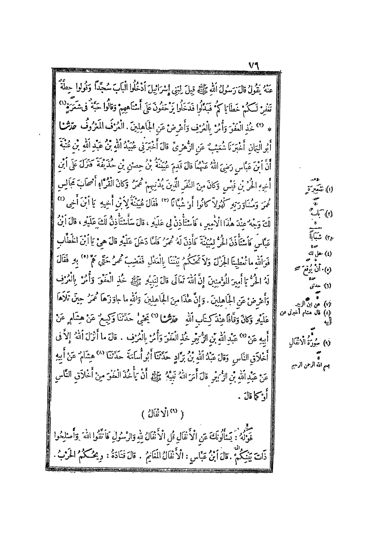 4642 - حَدَّثَنَا أَبُو اليَمَانِ، حَدَّثَنَا شُعَيْبٌ، عَنِ الزُّهْرِيِّ، قَالَ: أَخْبَرَنِي عُبَيْدُ اللهِ بْنُ عَبْدِ اللهِ بْنِ عُتْبَةَ، أَنَّ ابْنَ عَبَّاسٍ، رَضِيَ اللَّهُ عَنْهُمَا، قَالَ: قَدِمَ عُيَيْنَةُ بْنُ حِصْنِ بْنِ حُذَيْفَةَ , فَنَزَلَ عَلَى ابْنِ أَخِيهِ الحُرِّ بْنِ قَيْسٍ، وَكَانَ مِنَ النَّفَرِ الَّذِينَ يُدْنِيهِمْ عُمَرُ، وَكَانَ القُرَّاءُ أَصْحَابَ مَجَالِسِ عُمَرَ وَمُشَاوَرَتِهِ، كُهُولاً كَانُوا أَوْ شُبَّانًا، فَقَالَ عُيَيْنَةُ لاِبْنِ أَخِيهِ: يَا ابْنَ أَخِي، لَكَ وَجْهٌ عِنْدَ هَذَا الأَمِيرِ، فَاسْتَأْذِنْ لِي عَلَيْهِ، قَالَ: سَأَسْتَأْذِنُ لَكَ عَلَيْهِ، قَالَ ابْنُ عَبَّاسٍ: فَاسْتَأْذَنَ الحُرُّ لِعُيَيْنَةَ , فَأَذِنَ لَهُ عُمَرُ، فَلَمَّا دَخَلَ عَلَيْهِ , قَالَ: هِيْ يَا ابْنَ الخَطَّابِ، فَوَاللهِ مَا تُعْطِينَا الجَزْلَ، وَلاَ تَحْكُمُ بَيْنَنَا بِالعَدْلِ، فَغَضِبَ عُمَرُ حَتَّى هَمَّ بِهِ، فَقَالَ لَهُ الحُرُّ: يَا أَمِيرَ المُؤْمِنِينَ، إِنَّ اللَّهَ تَعَالَى قَالَ لِنَبِيِّهِ صَلَّى اللَّهُ عَلَيْهِ وَسَلَّمَ: {خُذِ العَفْوَ وَأْمُرْ بِالعُرْفِ وَأَعْرِضْ عَنِ الجَاهِلِينَ} وَإِنَّ هَذَا مِنَ الجَاهِلِينَ، وَاللهِ مَا جَاوَزَهَا عُمَرُ حِينَ تَلاَهَا عَلَيْهِ، وَكَانَ وَقَّافًا عِنْدَ كِتَابِ اللهِ.