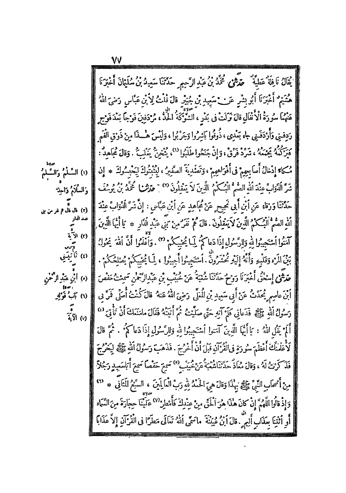 4647- حَدَّثَنِي إِسْحَاقُ ، قَالَ : أَخْبَرَنَا رَوْحٌ ، حَدَّثَنَا شُعْبَةُ ، عَنْ خُبَيْبِ بْنِ عَبْدِ الرَّحْمَنِ ، سَمِعْتُ حَفْصَ بْنَ عَاصِمٍ يُحَدِّثُ عَنْ أَبِي سَعِيدِ بْنِ المُعَلَّى ، رَضِيَ اللَّهُ عَنْهُ ، قَالَ : كُنْتُ أُصَلِّي , فَمَرَّ بِي رَسُولُ اللهِ صَلَّى اللَّهُ عَلَيْهِ وَسَلَّمَ فَدَعَانِي ، فَلَمْ آتِهِ حَتَّى صَلَّيْتُ , ثُمَّ أَتَيْتُهُ ، فَقَالَ : مَا مَنَعَكَ أَنْ تَأْتِيَ ؟ أَلَمْ يَقُلِ اللَّهُ : {يَا أَيُّهَا الَّذِينَ آمَنُوا اسْتَجِيبُوا لِلَّهِ وَلِلرَّسُولِ إِذَا دَعَاكُمْ} ؟ ثُمَّ قَالَ : لأُعَلِّمَنَّكَ أَعْظَمَ سُورَةٍ فِي القُرْآنِ قَبْلَ أَنْ أَخْرُجَ ، فَذَهَبَ رَسُولُ اللهِ صَلَّى اللَّهُ عَلَيْهِ وَسَلَّمَ لِيَخْرُجَ فَذَكَرْتُ لَهُ.