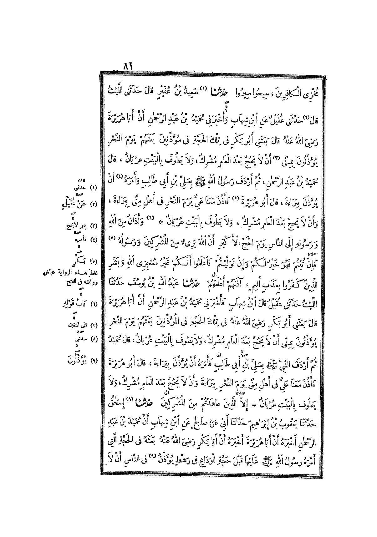 4655- حَدَّثَنَا سَعِيدُ بْنُ عُفَيْرٍ ، قَالَ : حَدَّثَنِي اللَّيْثُ , عَنْ عُقَيْلٍ ، عَنِ ابْنِ شِهَابٍ ، وَأَخْبَرَنِي حُمَيْدُ بْنُ عَبْدِ الرَّحْمَنِ ، أَنَّ أَبَا هُرَيْرَةَ ، رَضِيَ اللَّهُ عَنْهُ ، قَالَ : بَعَثَنِي أَبُو بَكْرٍ فِي تِلْكَ الحَجَّةِ فِي مُؤَذِّنِينَ بَعَثَهُمْ يَوْمَ النَّحْرِ يُؤَذِّنُونَ بِمِنًى : أَنْ لاَ يَحُجَّ بَعْدَ العَامِ مُشْرِكٌ ، وَلاَ يَطُوفَ بِالْبَيْتِ عُرْيَانٌ ، قَالَ حُمَيْدُ بْنُ عَبْدِ الرَّحْمَنِ : ثُمَّ أَرْدَفَ رَسُولُ اللهِ صَلَّى اللَّهُ عَلَيْهِ وَسَلَّمَ بِعَلِيِّ بْنِ أَبِي طَالِبٍ ، وَأَمَرَهُ أَنْ يُؤَذِّنَ بِبَرَاءَةَ ، قَالَ أَبُو هُرَيْرَةَ : فَأَذَّنَ مَعَنَا عَلِيٌّ يَوْمَ النَّحْرِ فِي أَهْلِ مِنًى بِبَرَاءَةَ ، وَأَنْ لاَ يَحُجَّ بَعْدَ العَامِ مُشْرِكٌ ، وَلاَ يَطُوفَ بِالْبَيْتِ عُرْيَانٌ.