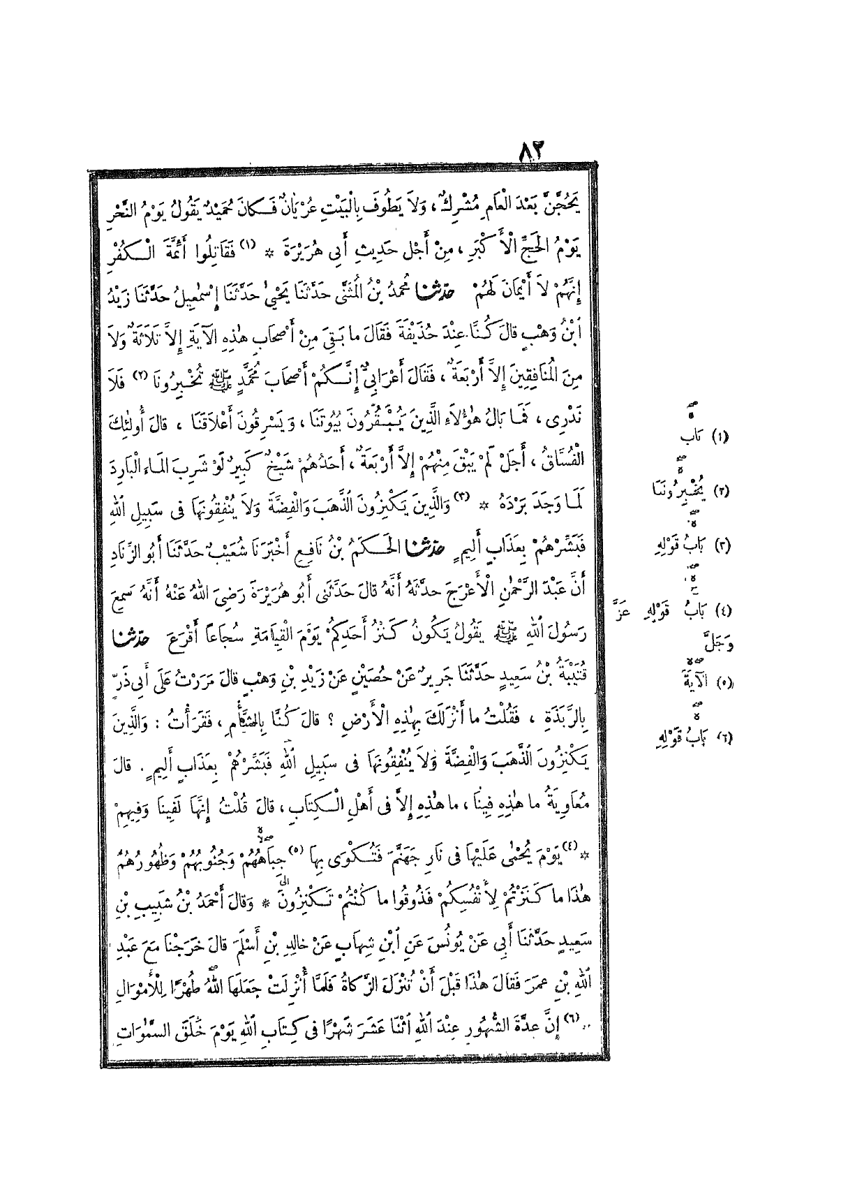 7- بَابُ قَوْلِهِ عَزَّ وَجَلَّ : {يَوْمَ يُحْمَى عَلَيْهَا فِي نَارِ جَهَنَّمَ فَتُكْوَى بِهَا جِبَاهُهُمْ وَجُنُوبُهُمْ وَظُهُورُهُمْ هَذَا مَا كَنَزْتُمْ لأَنْفُسِكُمْ فَذُوقُوا مَا كُنْتُمْ تَكْنِزُونَ}.