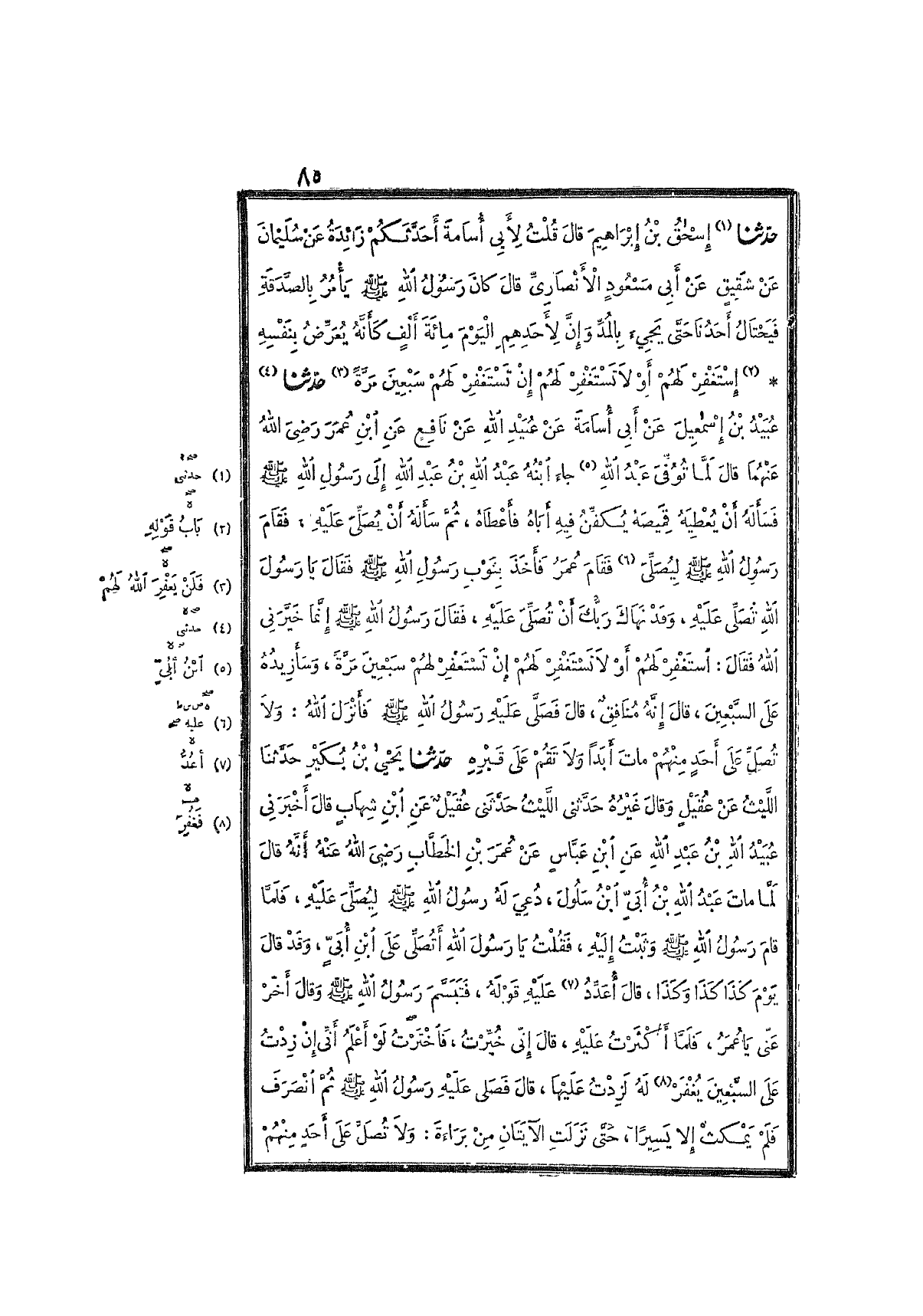 4670- حَدَّثَنِي عُبَيْدُ بْنُ إِسْمَاعِيلَ ، عَنْ أَبِي أُسَامَةَ ، عَنْ عُبَيْدِ اللهِ ، عَنْ نَافِعٍ ، عَنِ ابْنِ عُمَرَ ، رَضِيَ اللَّهُ عَنْهُمَا ، قَالَ : لَمَّا تُوُفِّيَ عَبْدُ اللهِ ابْنُ أُبَيٍ , جَاءَ ابْنُهُ عَبْدُ اللهِ بْنُ عَبْدِ اللهِ إِلَى رَسُولِ اللهِ صَلَّى اللَّهُ عَلَيْهِ وَسَلَّمَ ، فَسَأَلَهُ أَنْ يُعْطِيَهُ قَمِيصَهُ يُكَفِّنُ فِيهِ أَبَاهُ ، فَأَعْطَاهُ ، ثُمَّ سَأَلَهُ أَنْ يُصَلِّيَ عَلَيْهِ ، فَقَامَ رَسُولُ اللهِ صَلَّى اللَّهُ عَلَيْهِ وَسَلَّمَ لِيُصَلِّيَ عَلَيْهِ ، فَقَامَ عُمَرُ , فَأَخَذَ بِثَوْبِ رَسُولِ اللهِ صَلَّى اللَّهُ عَلَيْهِ وَسَلَّمَ ، فَقَالَ : يَا رَسُولَ اللهِ , أَتُصَلِّي عَلَيْهِ ، وَقَدْ نَهَاكَ رَبُّكَ أَنْ تُصَلِّيَ عَلَيْهِ ؟ فَقَالَ رَسُولُ اللهِ صَلَّى اللَّهُ عَلَيْهِ وَسَلَّمَ : إِنَّمَا خَيَّرَنِي اللَّهُ , فَقَالَ : {اسْتَغْفِرْ لَهُمْ أَوْ لاَ تَسْتَغْفِرْ لَهُمْ إِنْ تَسْتَغْفِرْ لَهُمْ سَبْعِينَ مَرَّةً} وَسَأَزِيدُهُ عَلَى السَّبْعِينَ , قَالَ : إِنَّهُ مُنَافِقٌ ، قَالَ : فَصَلَّى عَلَيْهِ رَسُولُ اللهِ صَلَّى اللَّهُ عَلَيْهِ وَسَلَّمَ ، فَأَنْزَلَ اللَّهُ : {وَلاَ تُصَلِّ عَلَى أَحَدٍ مِنْهُمْ مَاتَ أَبَدًا وَلاَ تَقُمْ عَلَى قَبْرِهِ}.