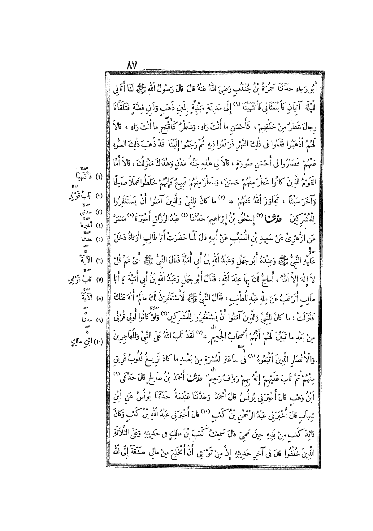 4675- حَدَّثَنَا إِسْحَاقُ بْنُ إِبْرَاهِيمَ ، حَدَّثَنَا عَبْدُ الرَّزَّاقِ ، أَخْبَرَنَا مَعْمَرٌ ، عَنِ الزُّهْرِيِّ ، عَنْ سَعِيدِ بْنِ الْمُسَيَّبِ ، عَنْ أَبِيهِ ، قَالَ : لَمَّا حَضَرَتْ أَبَا طَالِبٍ الوَفَاةُ , دَخَلَ عَلَيْهِ النَّبِيُّ صَلَّى اللَّهُ عَلَيْهِ وَسَلَّمَ ، وَعِنْدَهُ أَبُو جَهْلٍ , وَعَبْدُ اللهِ بْنُ أَبِي أُمَيَّةَ ، فَقَالَ النَّبِيُّ صَلَّى اللَّهُ عَلَيْهِ وَسَلَّمَ : أَيْ عَمِّ ، قُلْ : لاَ إِلَهَ إِلاَّ اللَّهُ , أُحَاجُّ لَكَ بِهَا عِنْدَ اللهِ ، فَقَالَ أَبُو جَهْلٍ ، وَعَبْدُ اللهِ بْنُ أَبِي أُمَيَّةَ : يَا أَبَا طَالِبٍ , أَتَرْغَبُ عَنْ مِلَّةِ عَبْدِ المُطَّلِبِ ، فَقَالَ النَّبِيُّ صَلَّى اللَّهُ عَلَيْهِ وَسَلَّمَ : لأَسْتَغْفِرَنَّ لَكَ مَا لَمْ أُنْهَ عَنْكَ ، فَنَزَلَتْ : {مَا كَانَ لِلنَّبِيِّ وَالَّذِينَ آمَنُوا أَنْ يَسْتَغْفِرُوا لِلْمُشْرِكِينَ وَلَوْ كَانُوا أُولِي قُرْبَى مِنْ بَعْدِ مَا تَبَيَّنَ لَهُمْ أَنَّهُمْ أَصْحَابُ الجَحِيمِ}.