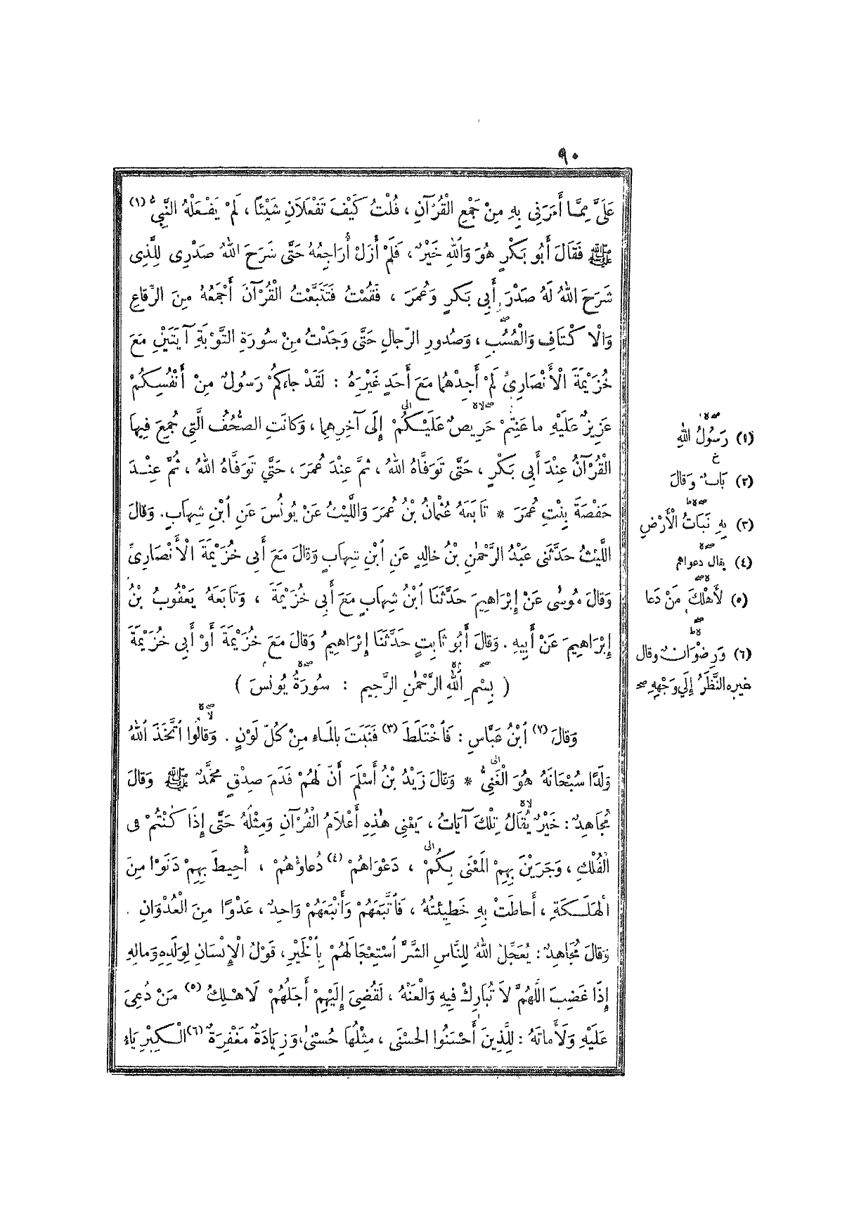 قُلْتُ : كَيْفَ تَفْعَلاَنِ شَيْئًا لَمْ يَفْعَلْهُ النَّبِيُّ صَلَّى اللَّهُ عَلَيْهِ وَسَلَّمَ ؟ فَقَالَ أَبُو بَكْرٍ : هُوَ وَاللهِ خَيْرٌ ، فَلَمْ أَزَلْ أُرَاجِعُهُ , حَتَّى شَرَحَ اللَّهُ صَدْرِي لِلَّذِي شَرَحَ اللَّهُ لَهُ صَدْرَ أَبِي بَكْرٍ , وَعُمَرَ ، فَقُمْتُ , فَتَتَبَّعْتُ القُرْآنَ أَجْمَعُهُ مِنَ الرِّقَاعِ , وَالأَكْتَافِ ، وَالعُسُبِ , وَصُدُورِ الرِّجَالِ ، حَتَّى وَجَدْتُ مِنْ سُورَةِ التَّوْبَةِ آيَتَيْنِ مَعَ خُزَيْمَةَ الأَنْصَارِيِّ , لَمْ أَجِدْهُمَا مَعَ أَحَدٍ غَيْرِهِ : {لَقَدْ جَاءَكُمْ رَسُولٌ مِنْ أَنْفُسِكُمْ عَزِيزٌ عَلَيْهِ مَا عَنِتُّمْ حَرِيصٌ عَلَيْكُمْ} إِلَى آخِرِهَا ، وَكَانَتِ الصُّحُفُ الَّتِي جُمِعَ فِيهَا القُرْآنُ عِنْدَ أَبِي بَكْرٍ حَتَّى تَوَفَّاهُ اللَّهُ ، ثُمَّ عِنْدَ عُمَرَ حَتَّى تَوَفَّاهُ اللَّهُ ، ثُمَّ عِنْدَ حَفْصَةَ بِنْتِ عُمَرَ.