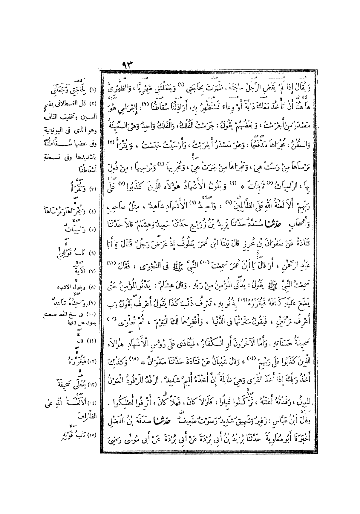 4685- حَدَّثَنَا مُسَدَّدٌ ، حَدَّثَنَا يَزِيدُ بْنُ زُرَيْعٍ ، حَدَّثَنَا سَعِيدٌ , وَهِشَامٌ ، قَالاَ : حَدَّثَنَا قَتَادَةُ ، عَنْ صَفْوَانَ بْنِ مُحْرِزٍ ، قَالَ : بَيْنَا ابْنُ عُمَرَ يَطُوفُ , إِذْ عَرَضَ رَجُلٌ ، فَقَالَ : يَا أَبَا عَبْدِ الرَّحْمَنِ ، أَوْ قَالَ : يَا ابْنَ عُمَرَ ، هَلْ سَمِعْتَ النَّبِيَّ صَلَّى اللَّهُ عَلَيْهِ وَسَلَّمَ فِي النَّجْوَى ؟ فَقَالَ سَمِعْتُ النَّبِيَّ صَلَّى اللَّهُ عَلَيْهِ وَسَلَّمَ يَقُولُ : يُدْنَى المُؤْمِنُ مِنْ رَبِّهِ ، وَقَالَ هِشَامٌ : يَدْنُو المُؤْمِنُ ، حَتَّى يَضَعَ عَلَيْهِ كَنَفَهُ فَيُقَرِّرُهُ بِذُنُوبِهِ ، تَعْرِفُ ذَنْبَ كَذَا ؟ يَقُولُ : أَعْرِفُ ، يَقُولُ : رَبِّ أَعْرِفُ مَرَّتَيْنِ ، فَيَقُولُ : سَتَرْتُهَا فِي الدُّنْيَا ، وَأَغْفِرُهَا لَكَ اليَوْمَ ، ثُمَّ تُطْوَى صَحِيفَةُ حَسَنَاتِهِ ، وَأَمَّا الآخَرُونَ ، أَوِ الكُفَّارُ ، فَيُنَادَى عَلَى رُؤُوسِ الأَشْهَادِ : {هَؤُلاَءِ الَّذِينَ كَذَبُوا عَلَى رَبِّهِمْ}.