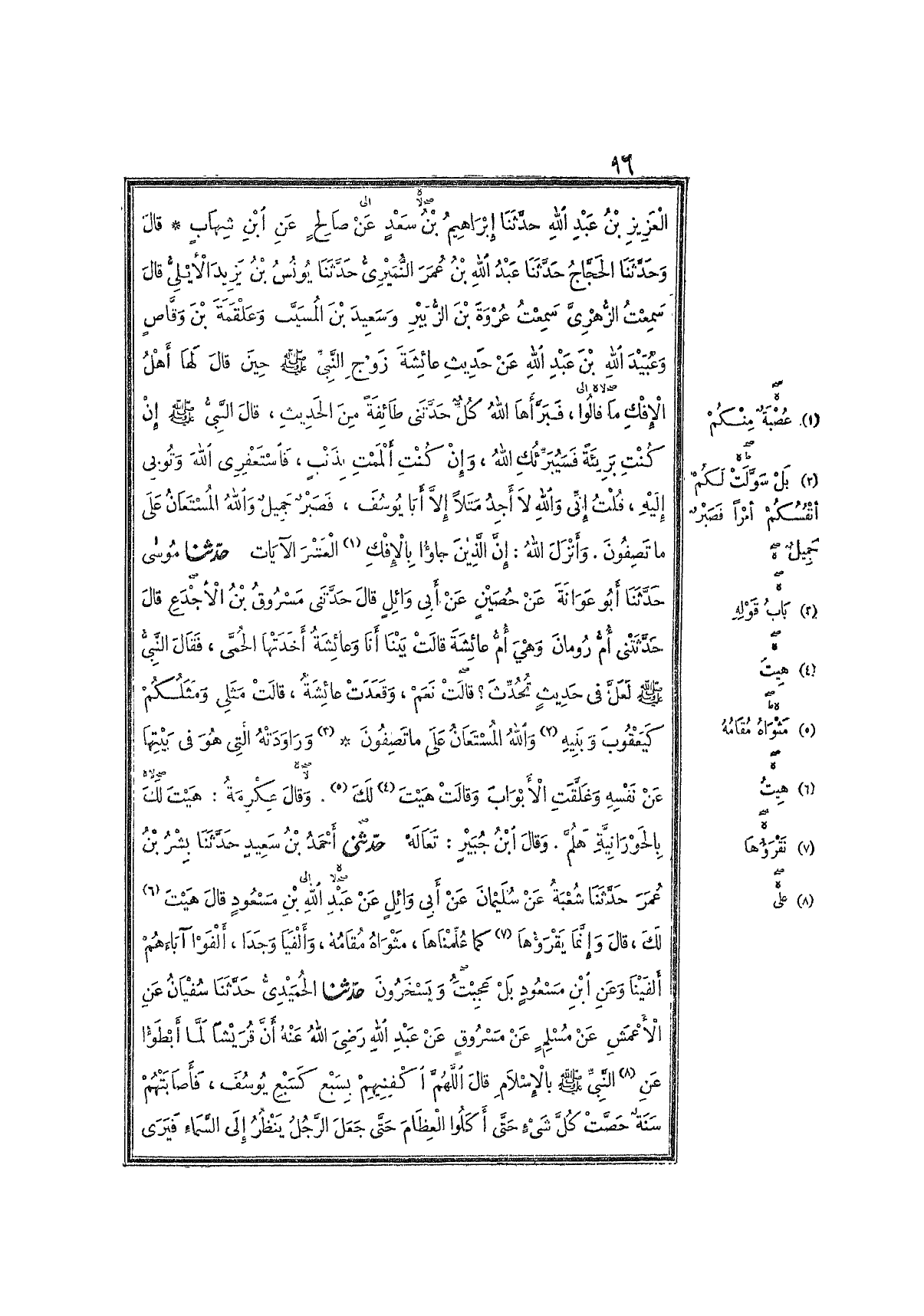 4691- حَدَّثَنَا مُوسَى ، حَدَّثَنَا أَبُو عَوَانَةَ ، عَنْ حُصَيْنٍ ، عَنْ أَبِي وَائِلٍ ، قَالَ : حَدَّثَنِي مَسْرُوقُ بْنُ الأَجْدَعِ ، قَالَ : حَدَّثَتْنِي أُمُّ رُومَانَ , وَهْيَ أُمُّ عَائِشَةَ ، قَالَتْ : بَيْنَا أَنَا وَعَائِشَةُ أَخَذَتْهَا الحُمَّى ، فَقَالَ النَّبِيُّ صَلَّى اللَّهُ عَلَيْهِ وَسَلَّمَ : لَعَلَّ فِي حَدِيثٍ تُحُدِّثَ ؟ قَالَتْ : نَعَمْ ، وَقَعَدَتْ عَائِشَةُ ، قَالَتْ : مَثَلِي وَمَثَلُكُمْ كَيَعْقُوبَ وَبَنِيهِ : {بَلْ سَوَّلَتْ لَكُمْ أَنْفُسُكُمْ أَمْرًا فَصَبْرٌ جَمِيلٌ وَاللَّهُ الْمُسْتَعَانُ عَلَى مَا تَصِفُونَ}.