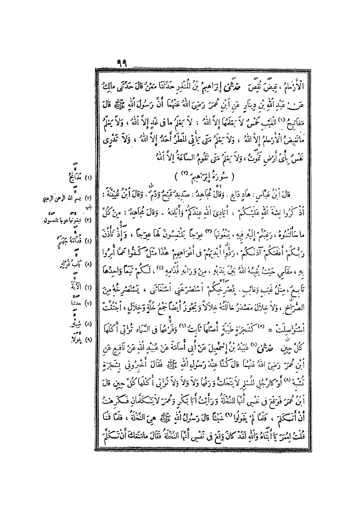 4697- حَدَّثَنِي إِبْرَاهِيمُ بْنُ المُنْذِرِ ، حَدَّثَنَا مَعْنٌ ، قَالَ : حَدَّثَنِي مَالِكٌ ، عَنْ عَبْدِ اللهِ بْنِ دِينَارٍ ، عَنِ ابْنِ عُمَرَ ، رَضِيَ اللَّهُ عَنْهُمَا ؛ أَنَّ رَسُولَ اللهِ صَلَّى اللَّهُ عَلَيْهِ وَسَلَّمَ قَالَ : مَفَاتِيحُ الغَيْبِ خَمْسٌ لاَ يَعْلَمُهَا إِلاَّ اللَّهُ : لاَ يَعْلَمُ مَا فِي غَدٍ إِلاَّ اللَّهُ ، وَلاَ يَعْلَمُ مَا تَغِيضُ الأَرْحَامُ إِلاَّ اللَّهُ ، وَلاَ يَعْلَمُ مَتَى يَأْتِي المَطَرُ أَحَدٌ إِلاَّ اللَّهُ ، وَلاَ تَدْرِي نَفْسٌ بِأَيِّ أَرْضٍ تَمُوتُ ، وَلاَ يَعْلَمُ مَتَى تَقُومُ السَّاعَةُ إِلاَّ اللَّهُ.